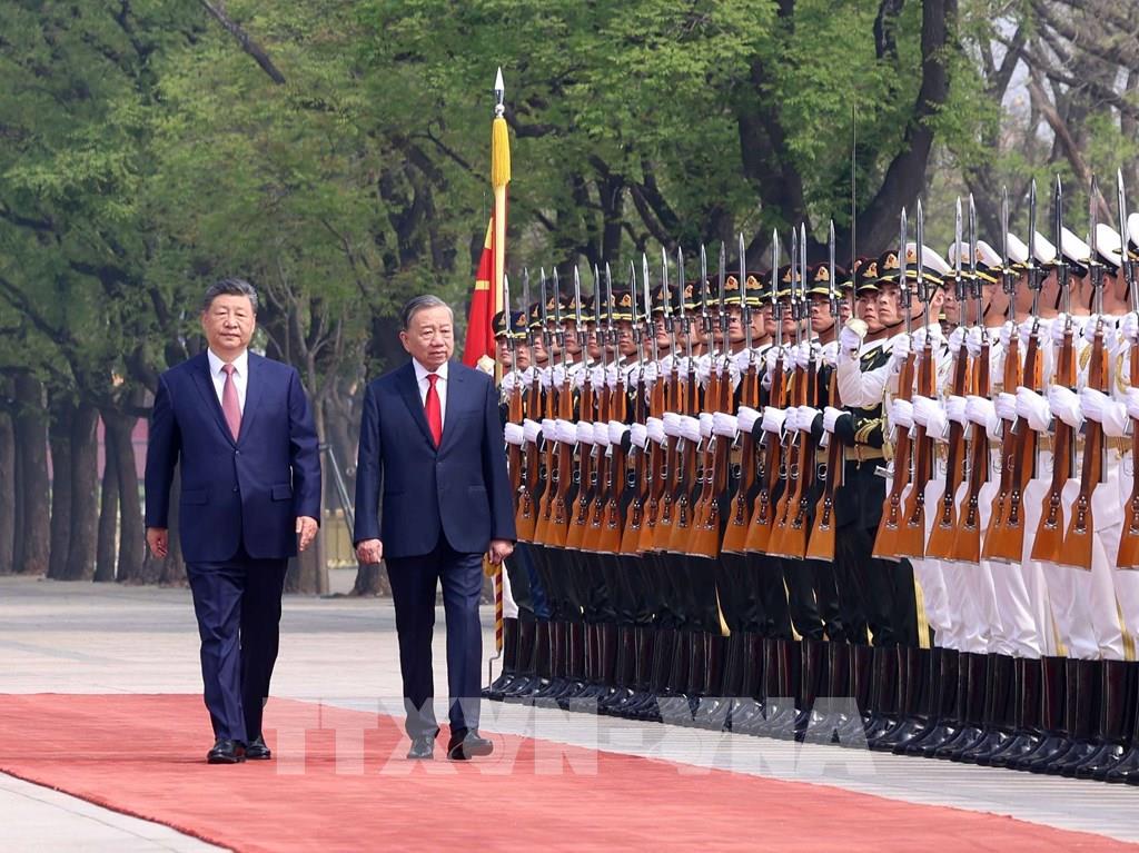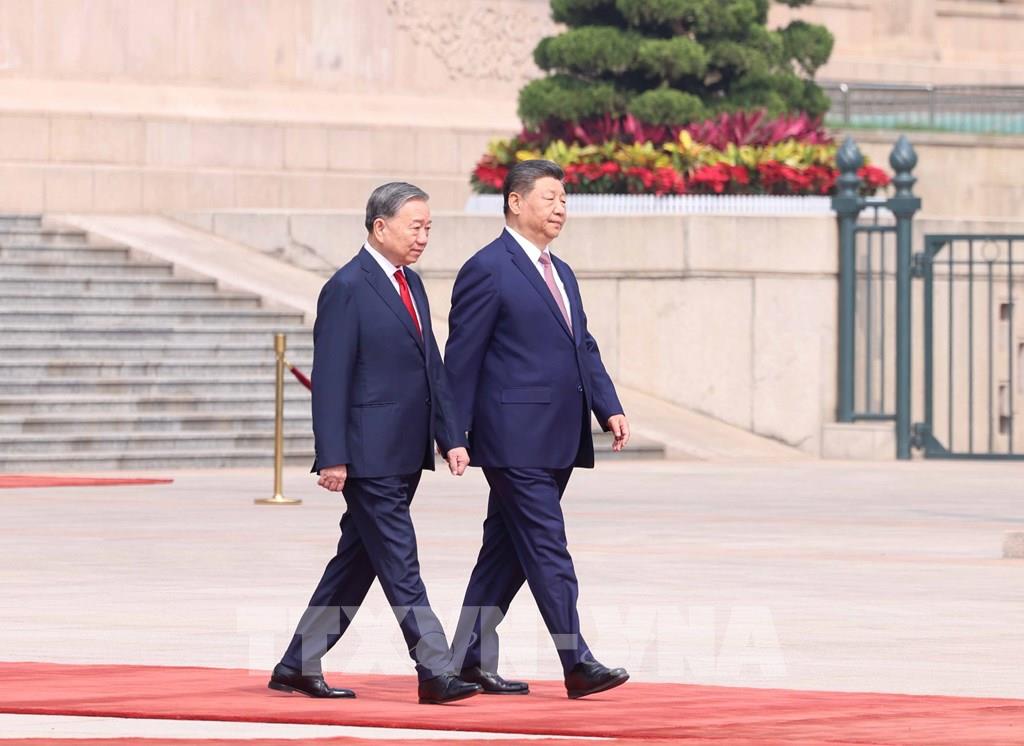 Tổng Bí thư, Chủ tịch nước Trung Quốc Tập Cận Bình và Tổng Bí thư, Chủ tịch nước Tô Lâm tại Lễ đón. Ảnh: Thống Nhất – TTXVN