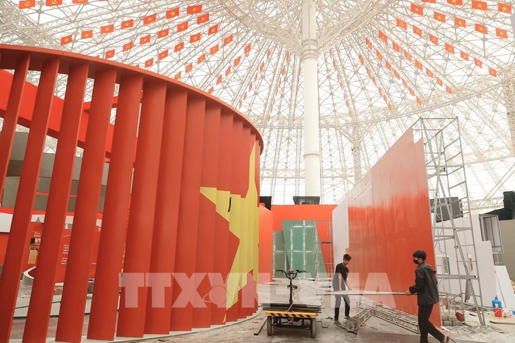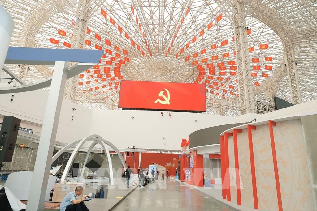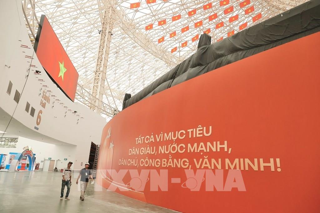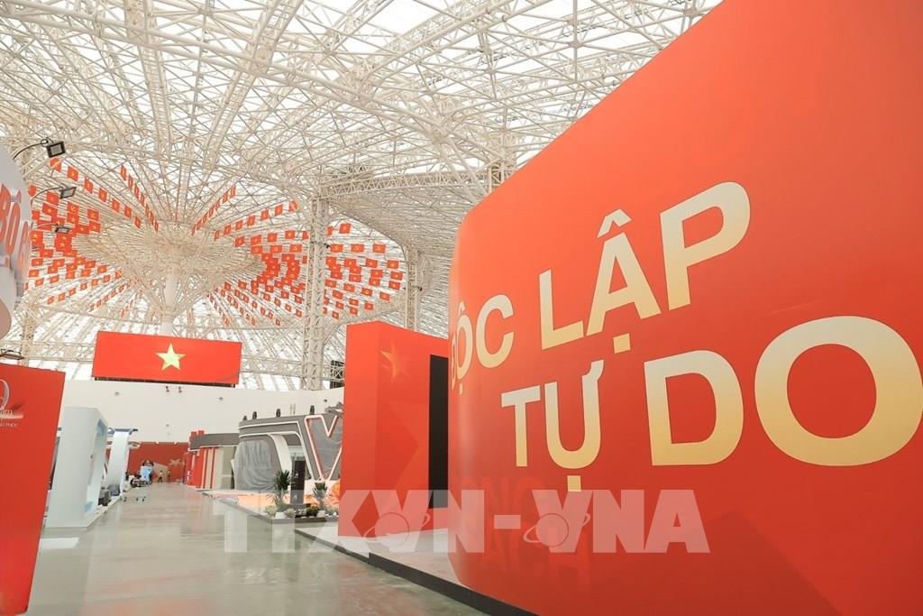 Không gian trưng bày của triển lãm gần 260.000 m² đang dần được lấp đầy những hình ảnh cờ đỏ sao vàng rực rỡ. Ảnh: Minh Quyết - TTXVN