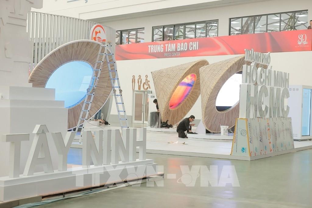 Các gian triển lãm của bộ, ngành, địa phương,.. đang được gấp rút hoàn thiện. Ảnh: Minh Quyết - TTXVN