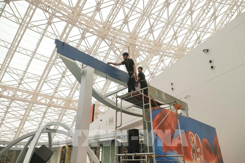 Công nhân hoàn thiện những hạng mục cuối, chuẩn bị cho khai mạc triển lãm vào ngày 28/8. Ảnh: Minh Quyết - TTXVN