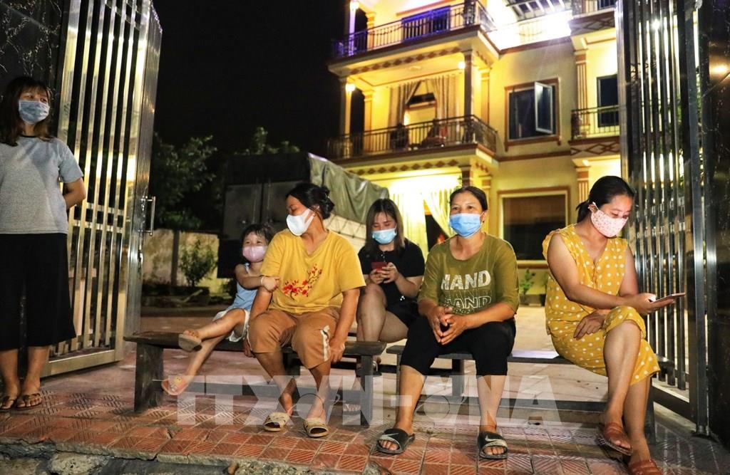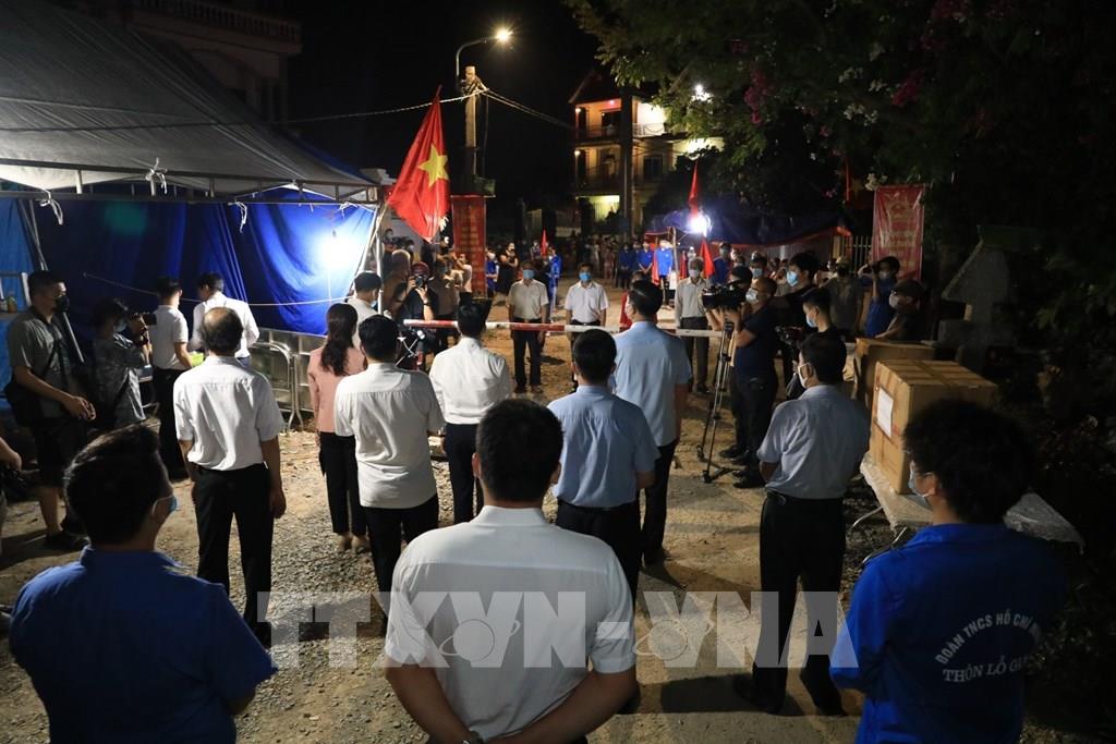 Cán bộ, nhân dân thôn Lỗ Giao thực hiện giãn cách chờ khoảnh khắc dỡ bỏ cách ly. Ảnh: Thành Đạt - TTXVN