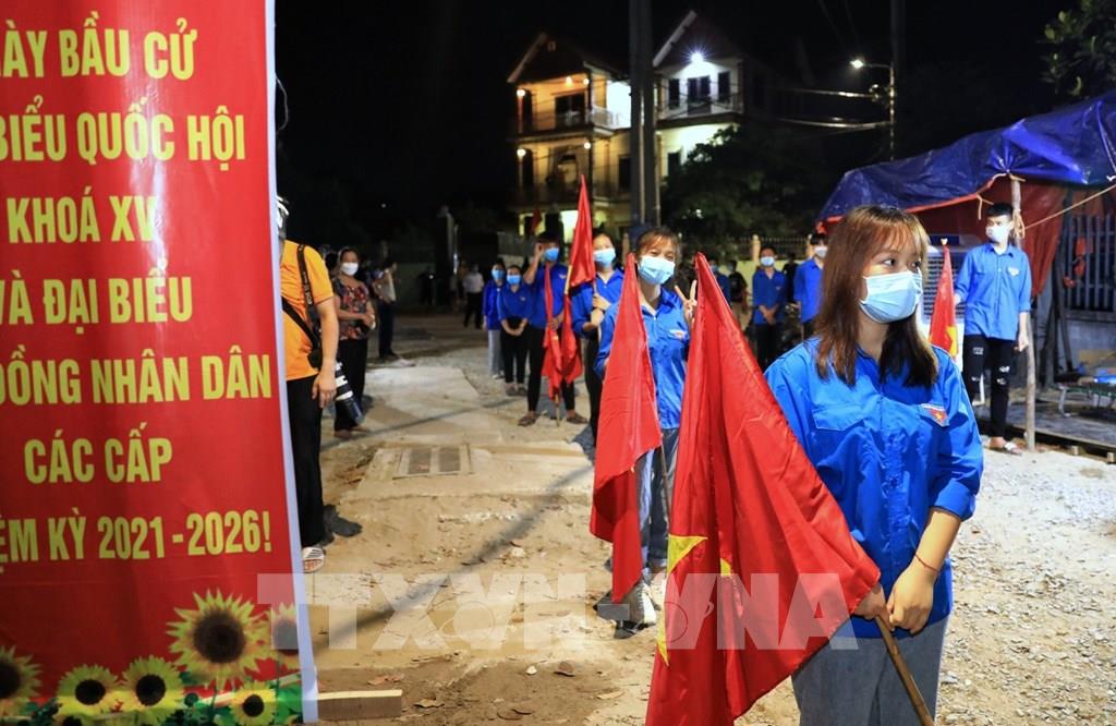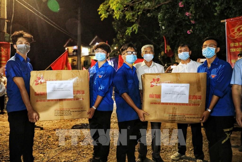 Lực lượng Đoàn Thanh niên thôn Lỗ Giao vui mừng phất cờ Tổ quốc sau khi có quyết định chính thức dỡ bỏ cách ly thôn. Ảnh: Thành Đạt - TTXVN