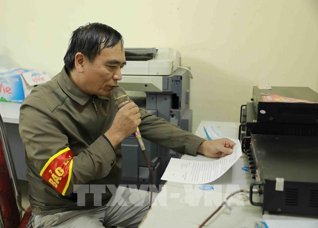 Nhân viên Ban Quản lý chợ đầu mối Minh Khai triển khai công tác tuyên truyền phòng chống dịch bệnh qua hệ thống loa phát thanh tại chợ. Ảnh: Vũ Sinh - TTXVN