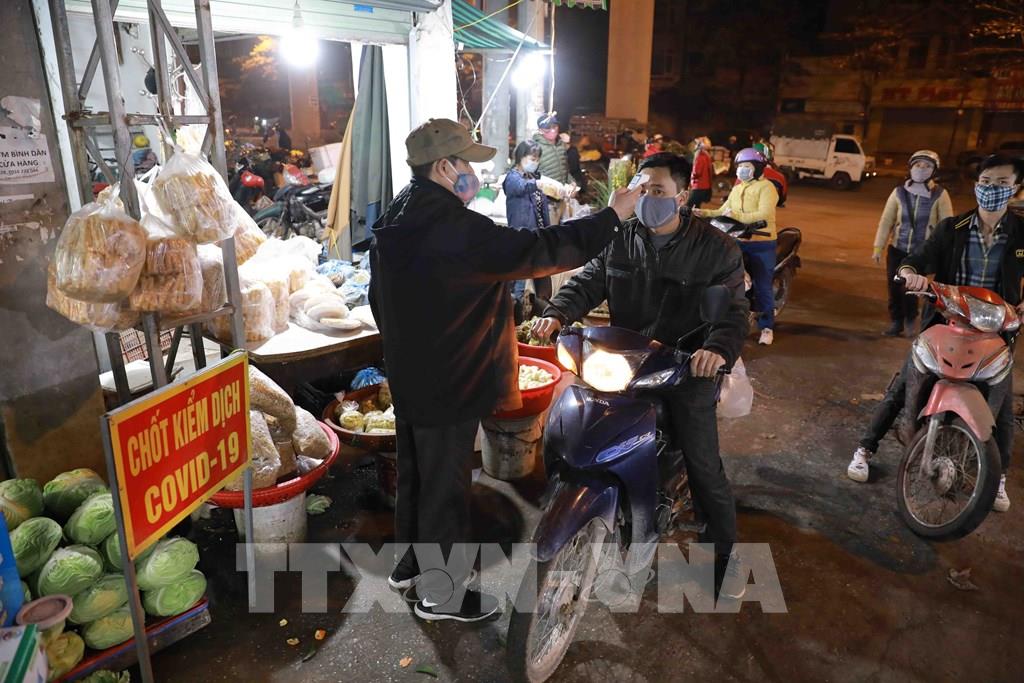 Ban Quản lý chợ tổ chức đo thân nhiệt cho 100% người ra vào chợ. Ảnh: Vũ SInh - TTXVN