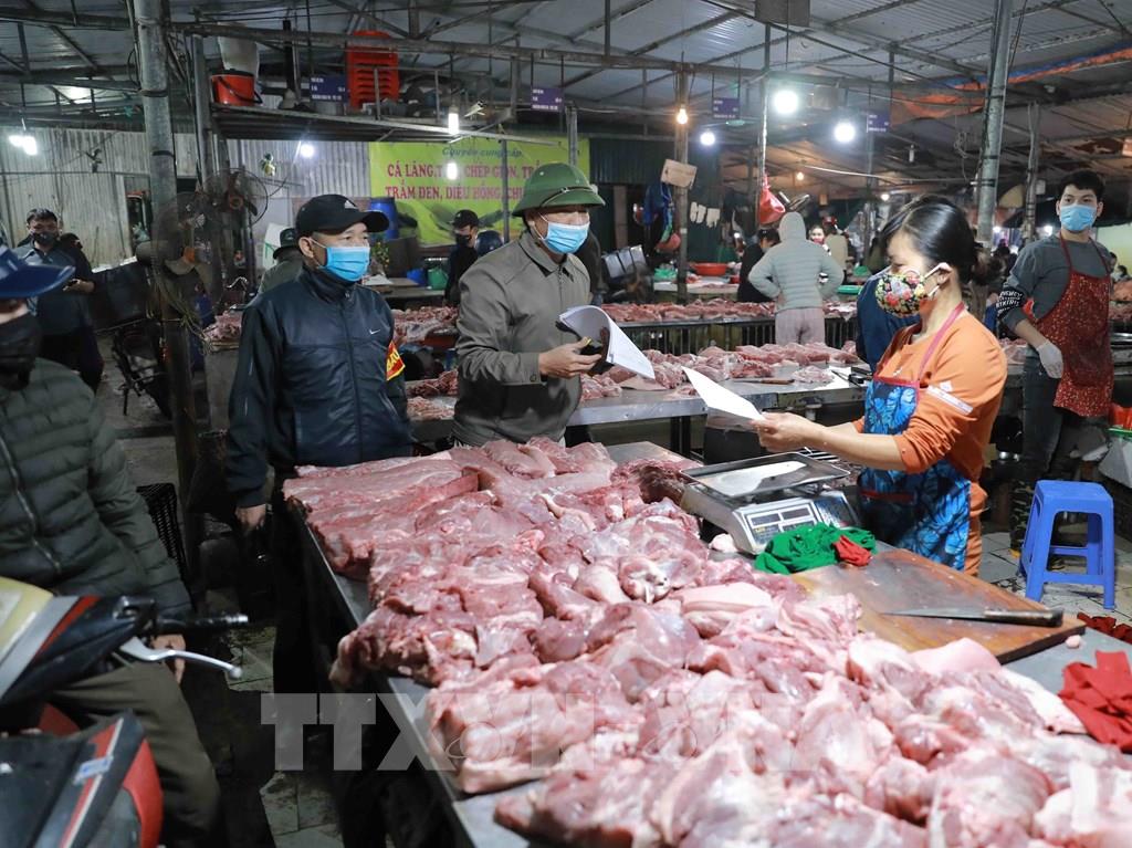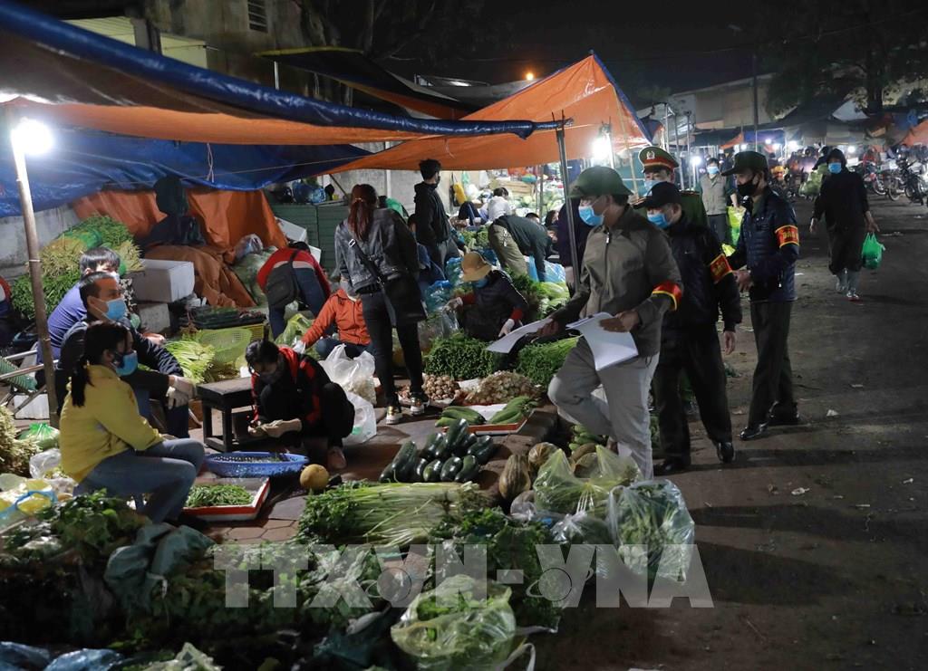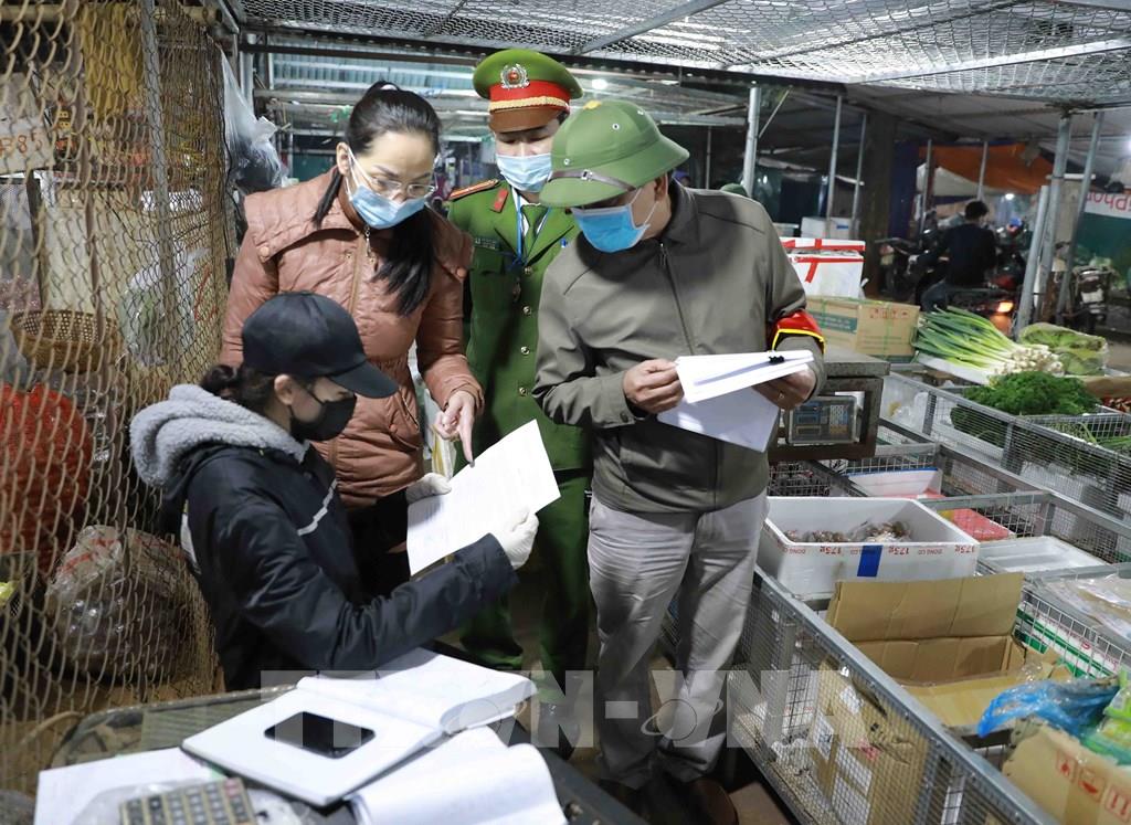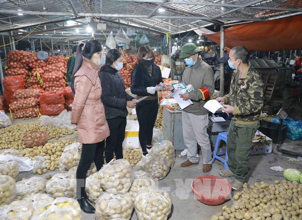 Các lực lượng chức năng và Ban Quản lý chợ, tuyên truyền việc chấp hành quy định về phòng chống dịch bệnh, đến với các tiểu thương và người dân mua sắm tại chợ. Ảnh: Vũ Sinh - TTXVN