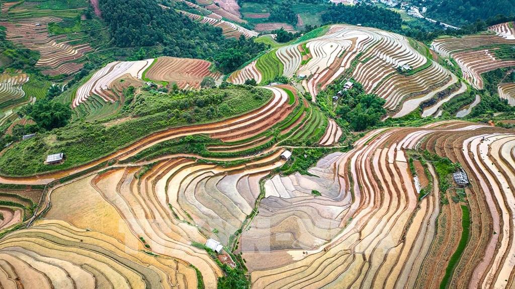 Vẻ đẹp của những thửa ruộng bậc thang mùa nước đổ tại xã Mồ Dề (huyện Mù Cang Chải, tỉnh Yên Bái). Ảnh: Khánh Hoà – TTXVN