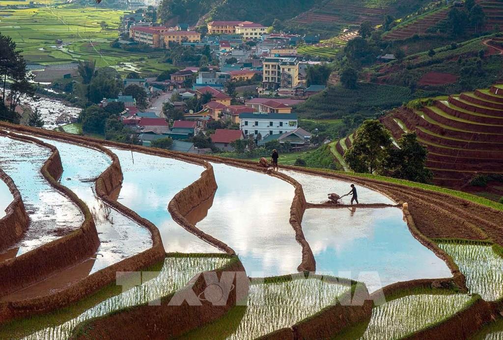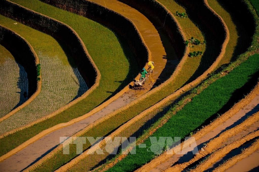 Mùa nước đổ cũng là thời điểm người dân Mù Cang Chải bận rộn bắt đầu vào vụ lúa mới. Ảnh: Khánh Hoà - TTXVN