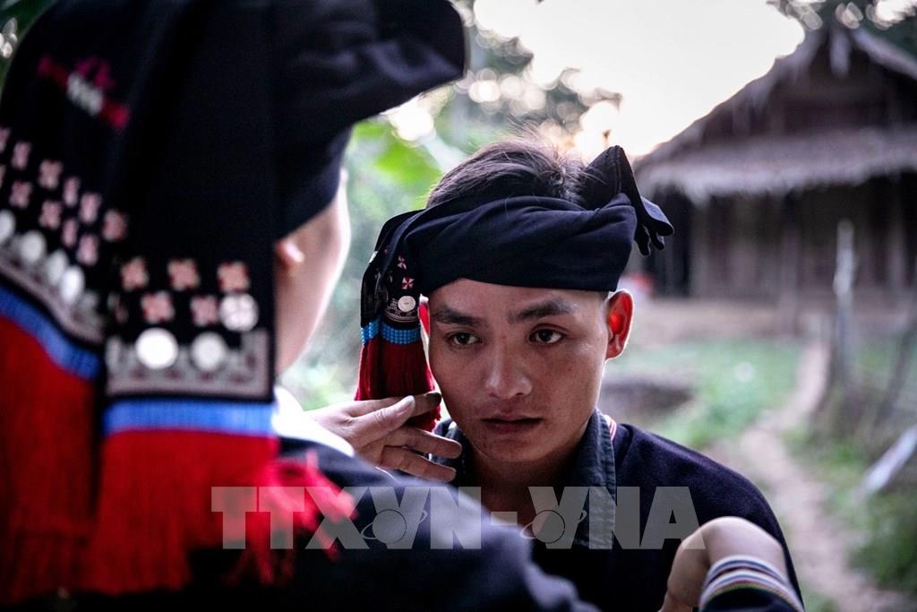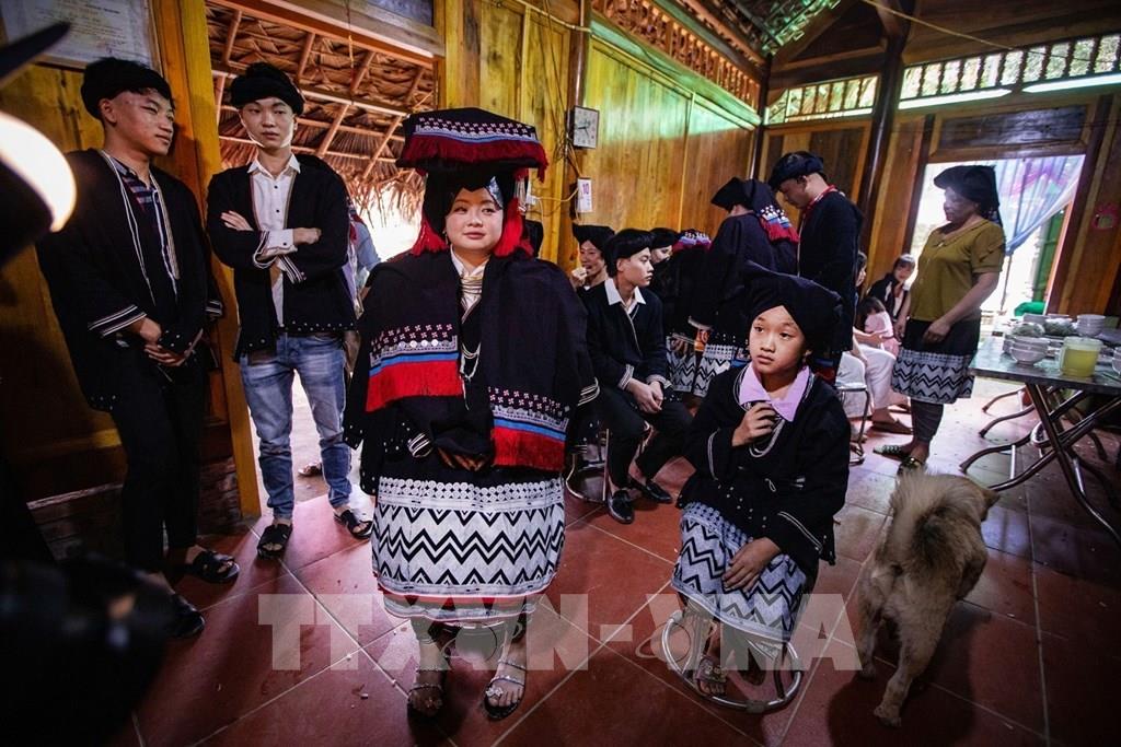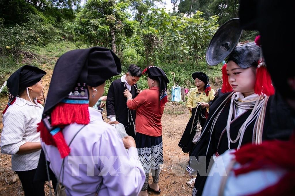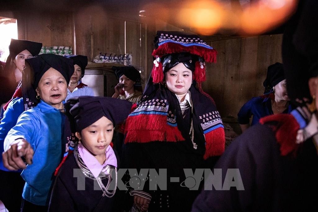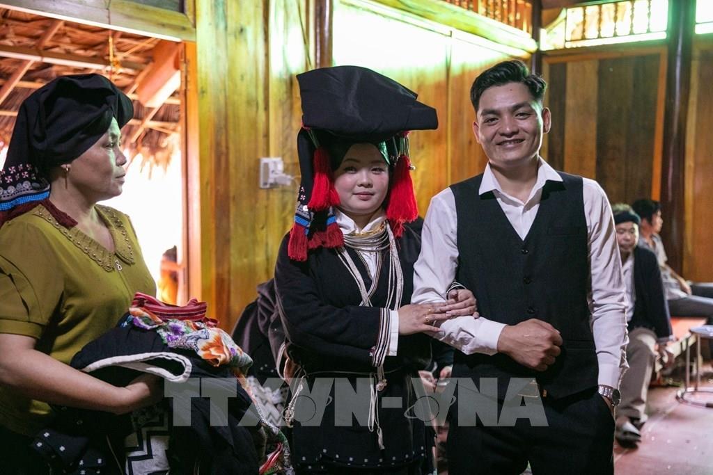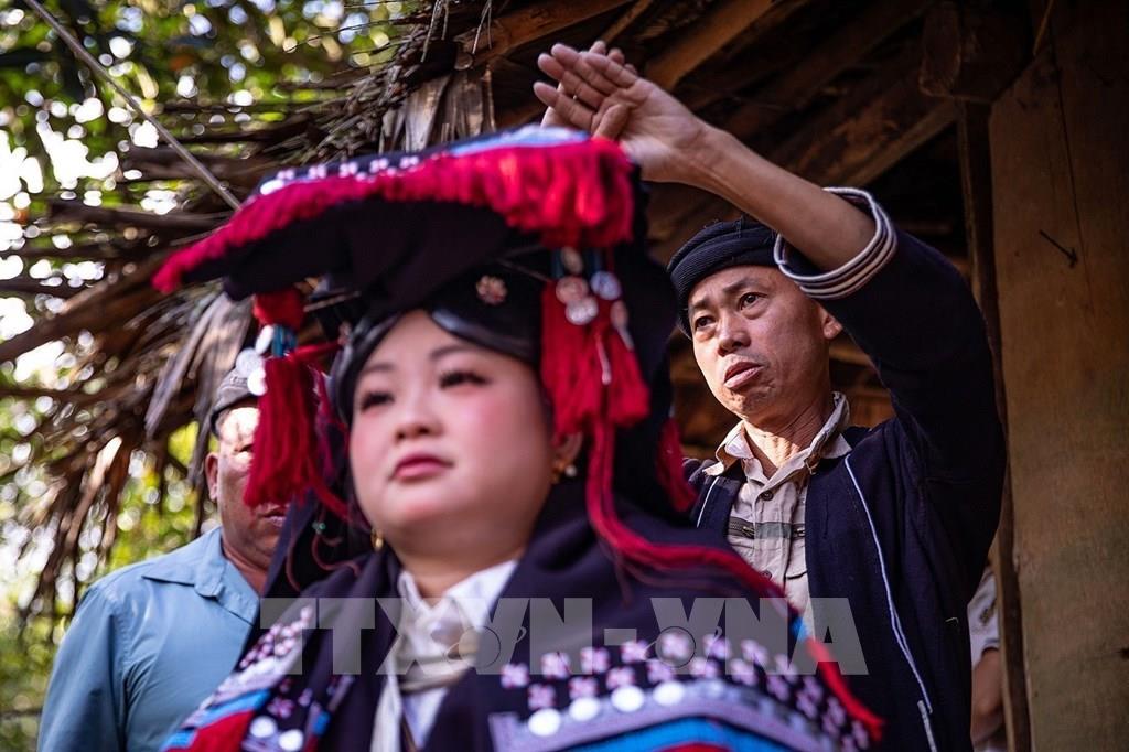 Chú rể và cô dâu sau khi kết thúc các nghi thức cưới tại rạp sẽ mặc lại trang phục truyền thống của người Dao Tiền rồi mới được dẫn vào gian thờ chính, nơi thầy cúng làm lễ báo cáo với tổ tiên Ảnh: Trọng Đạt-TTXVN