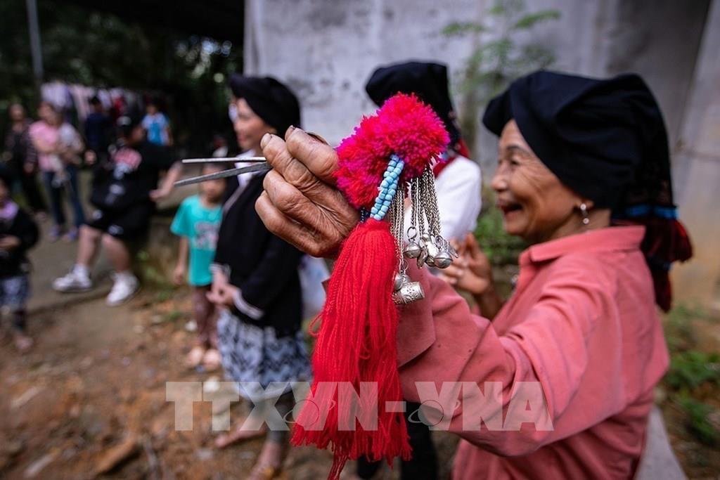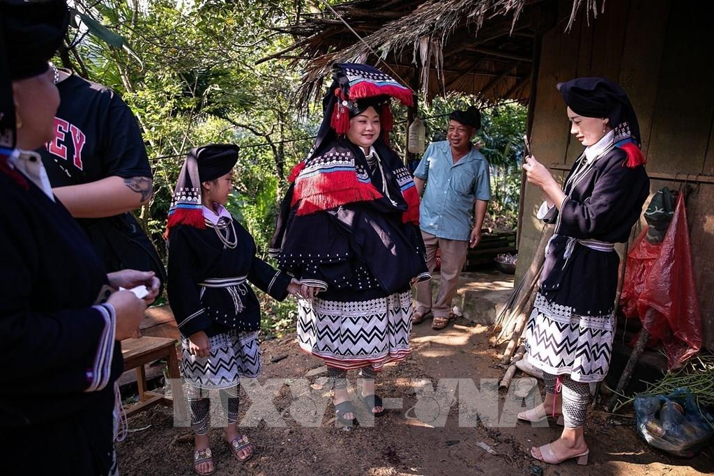 Người Dao Tiền quan niệm cô dâu càng được nhiều người mặc áo cho thì càng được yêu quý, phù hộ và che chở khỏi điều xấu trên đường về nhà chồng. Ảnh: Trọng Đạt - TTXVN