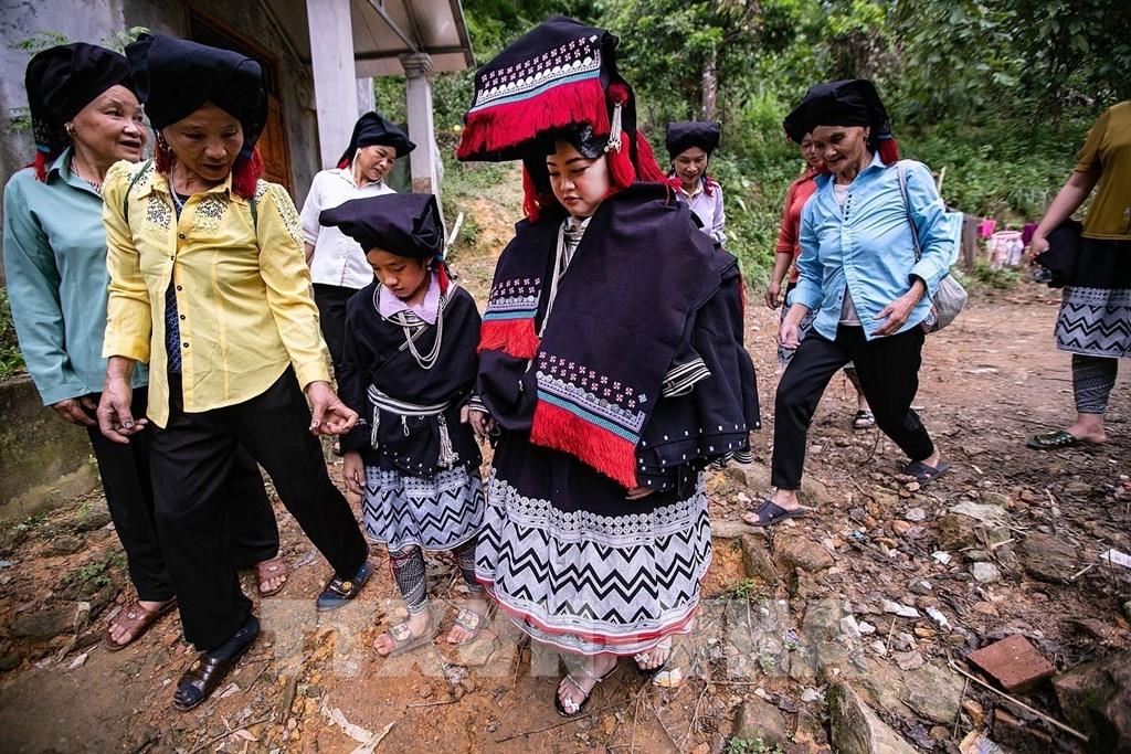 Trong đoàn rước, cô gái nhỏ dẫn dâu cầm tay cô dâu đi giữa các bà mối cảm ơn họ hàng hai bên. Ảnh: Trọng Đạt - TTXVN