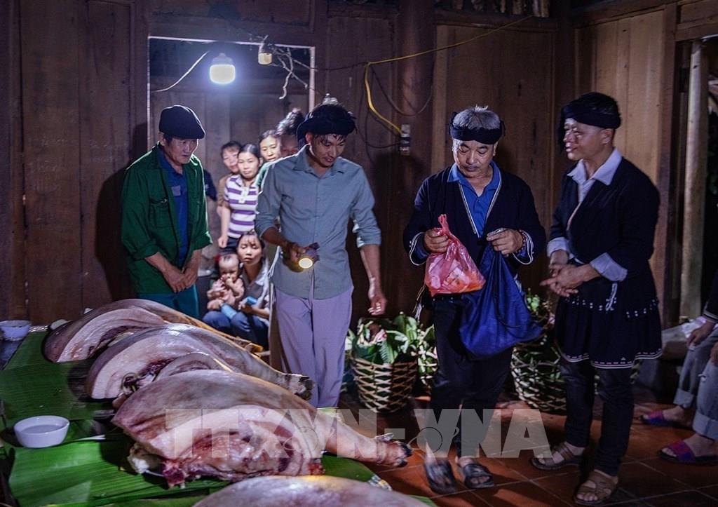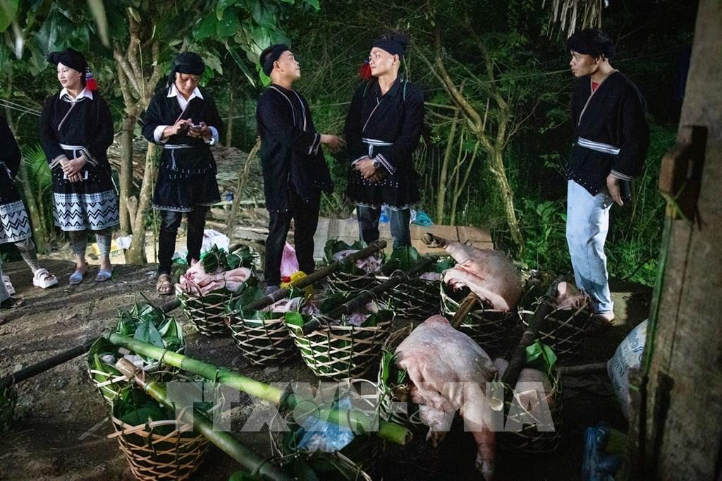 Nhà trai dâng lễ vật gồm thịt lợn, bánh, rượu, gà, muối… mang đến sẽ được người nhà gái kiểm tra đầy đủ. Ảnh: Trọng Đạt - TTXVN