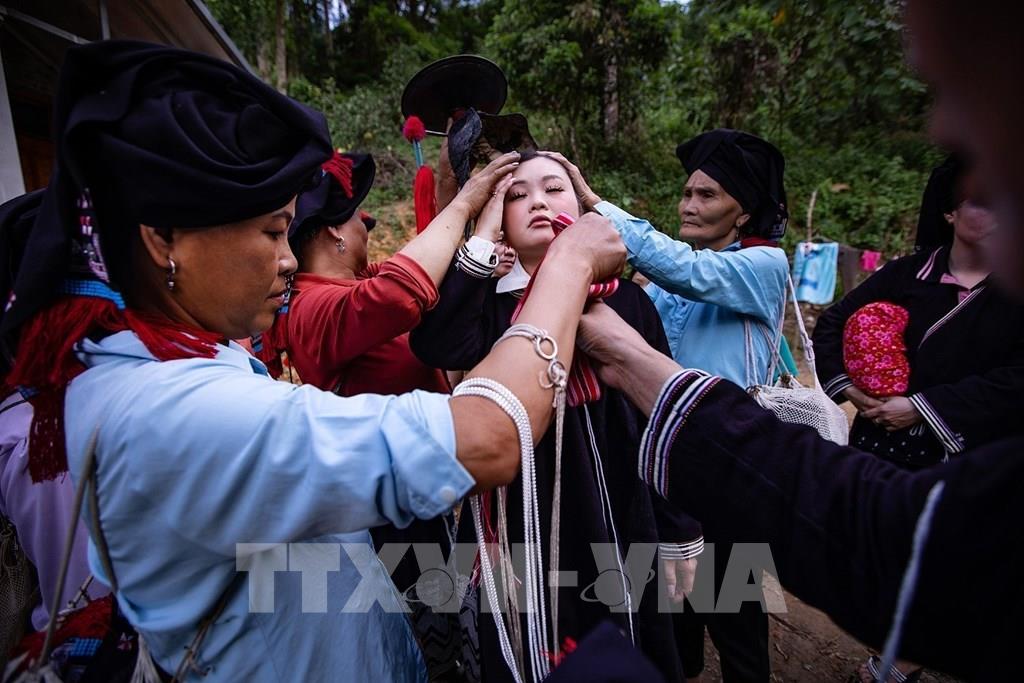 Người Dao Tiền quan niệm cô dâu càng được nhiều người mặc áo cho thì càng được yêu quý, phù hộ và che chở khỏi điều xấu trên đường về nhà chồng. Ảnh: Trọng Đạt-TTXVN