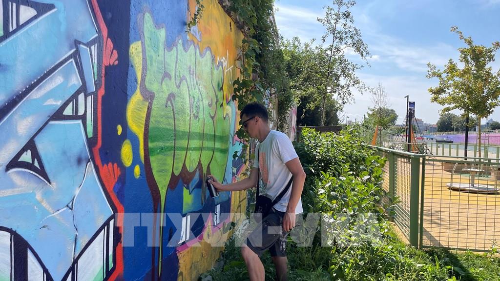 Họa sĩ Meuh, một chuyên gia vẽ tranh graffiti, sáng tạo tác phẩm của mình trên đường phố. Ảnh: Thu Hà - P/v TTXVN