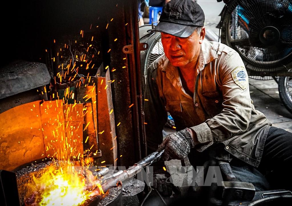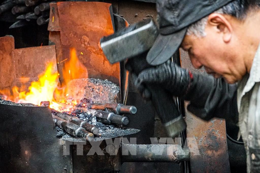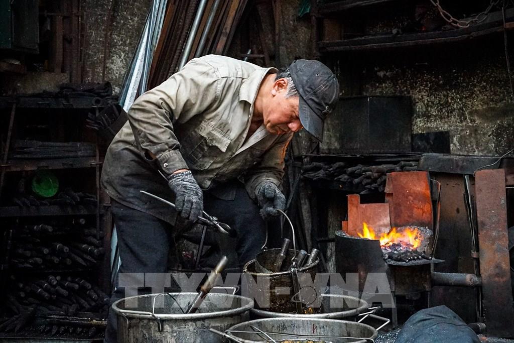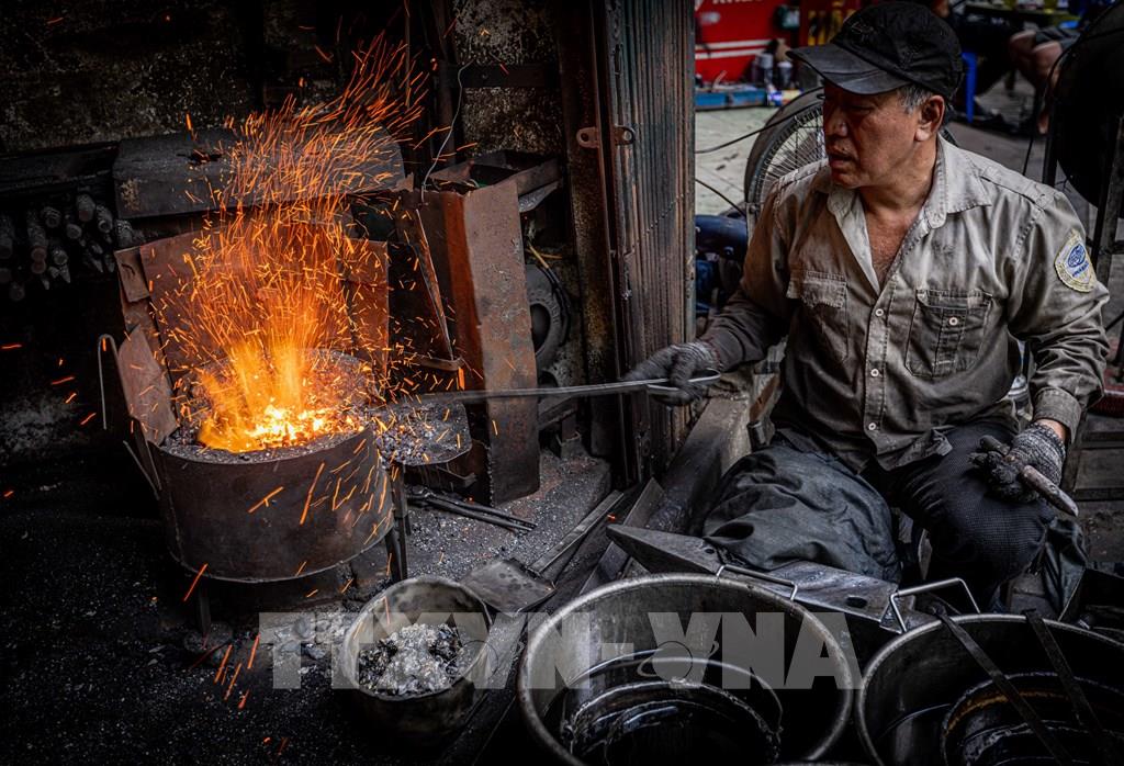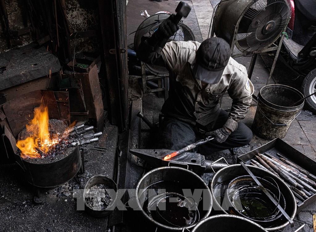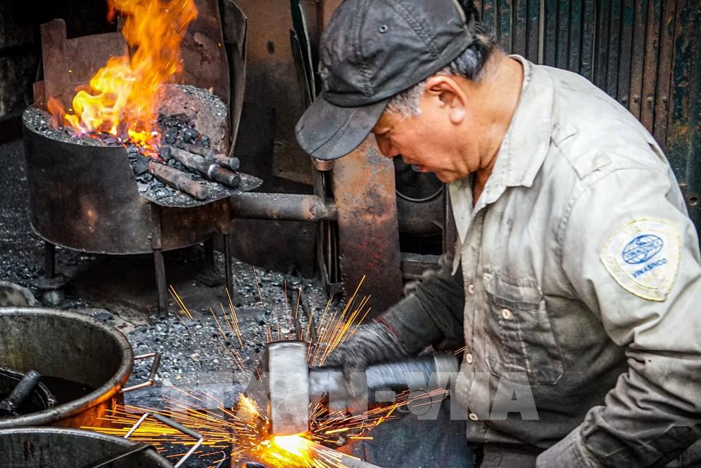 Hình ảnh người thợ già vẫn ngày ngày quay búa rèn sản phẩm là nét độc đáo rất riêng nơi phố cổ Lò Rèn. Ảnh: Hoàng Hiếu - TTXVN