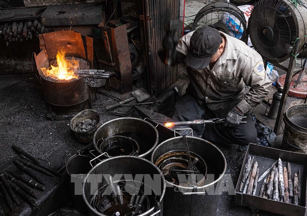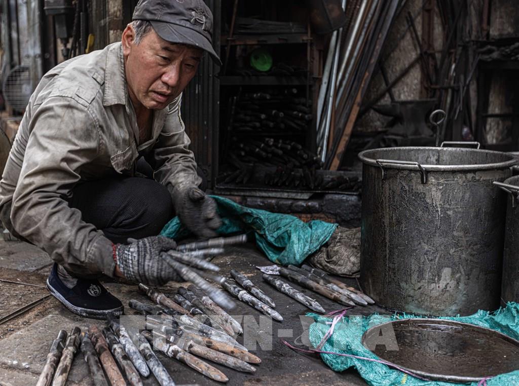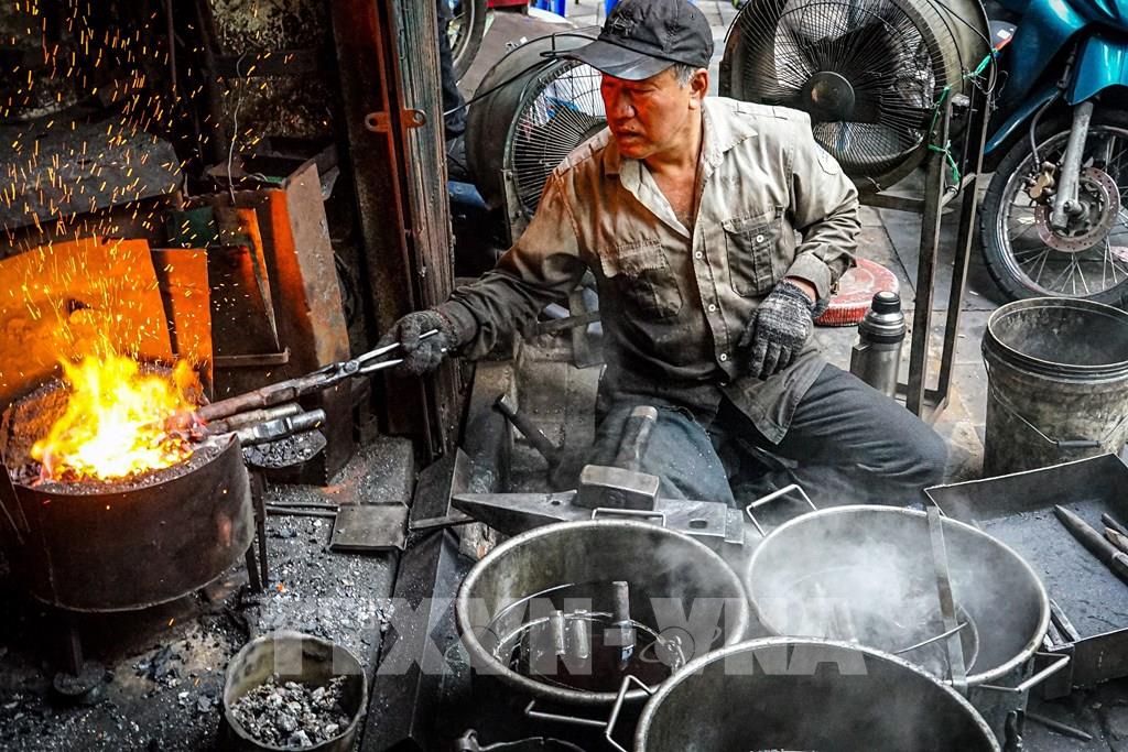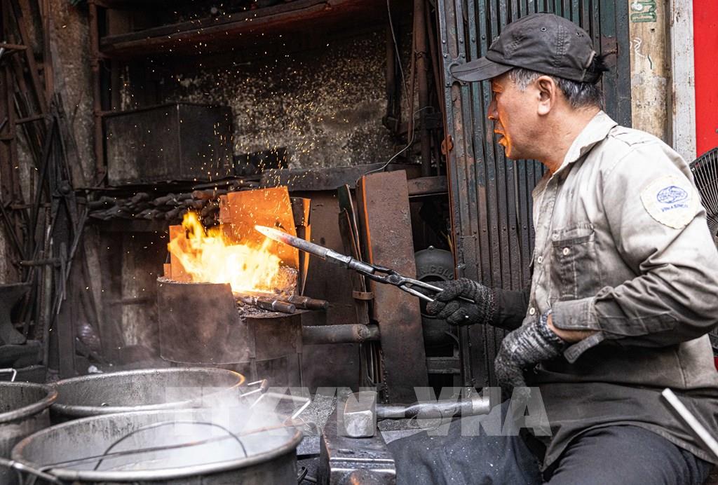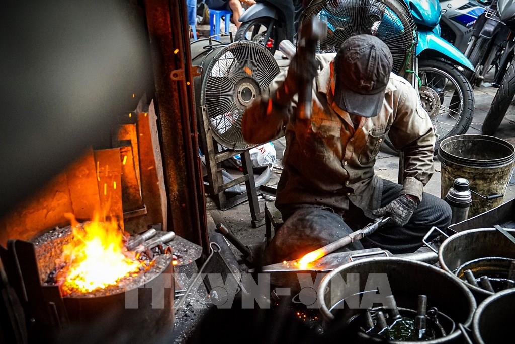 Hình ảnh người thợ già vẫn ngày ngày quay búa rèn sản phẩm là nét độc đáo rất riêng nơi phố cổ Lò Rèn. Ảnh: Hoàng Hiếu - TTXVN