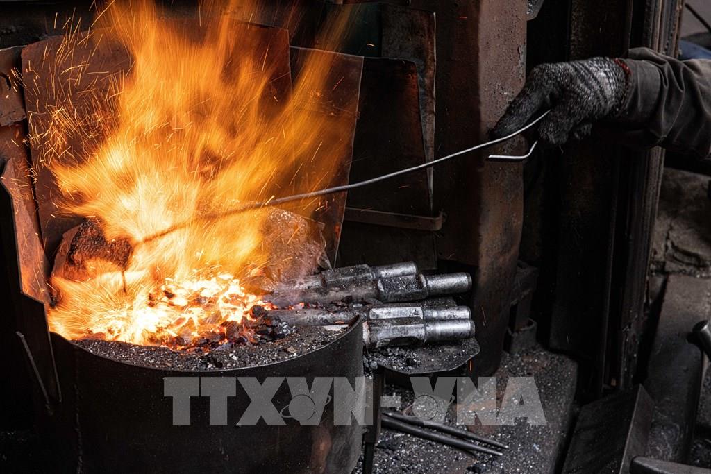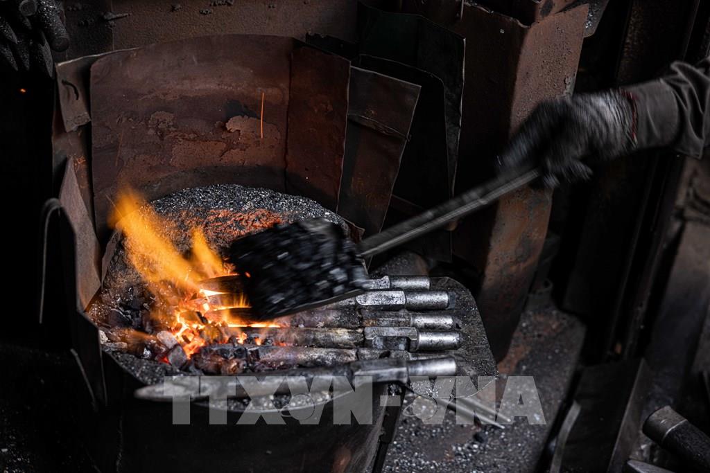 Bằng kinh nghiệm lâu năm trong nghề, người thợ chỉ cần quan sát màu lửa là có thể kiểm soát được nhiệt độ sản phẩm sắt để làm sao không già cũng không non. Ảnh: Hoàng Hiếu - TTXVN