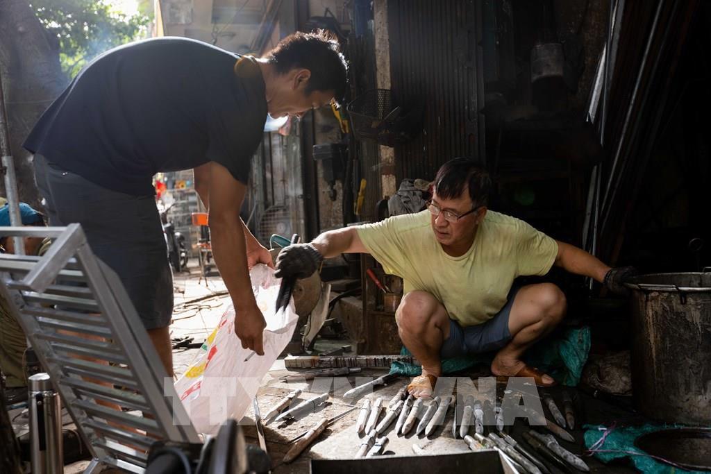 Hằng ngày, khách hàng tìm đến với thợ làm nghề duy nhất còn lại trên phố Lò Rèn nhờ gia công, sửa chữa. Ảnh: Khánh Hòa - TTXVN
