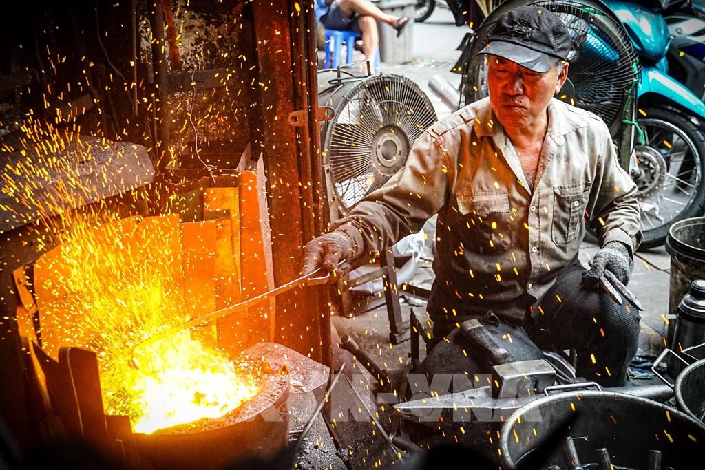 Hình ảnh người thợ già vẫn ngày ngày cần mẫn với búa, với đe, rèn sản phẩm là nét độc đáo rất riêng nơi phố cổ Lò Rèn. Ảnh: Hoàng Hiếu - TTXVN