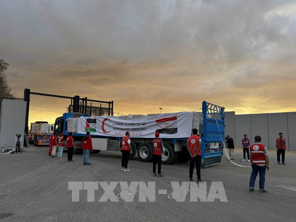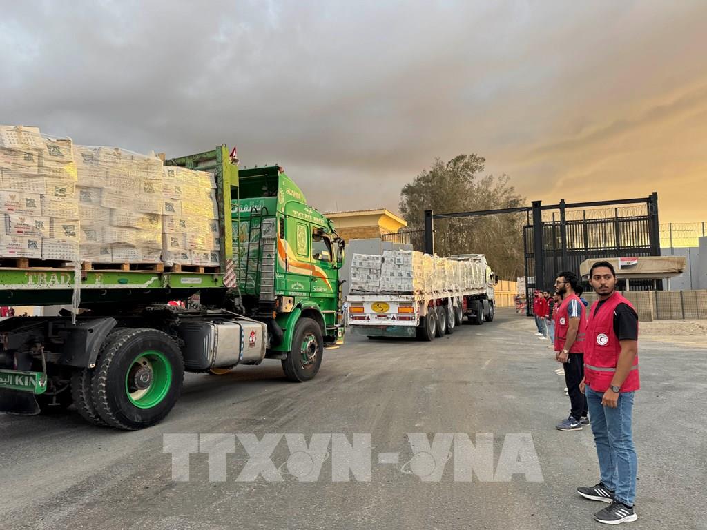 Israel đã giảm 50% số xe tải viện trợ được phép vào Dải Gaza, khu vực đang có hơn 500.000 người thiếu ăn nghiêm trọng. Truyền thông quốc tế cho biết Cơ quan điều phối các hoạt động tại vùng lãnh thổ (COGAT) của Israel ngày 14/10/2025 thông báo chỉ cho phép 300 xe tải viện trợ vào Gaza mỗi ngày, thay vì 600 xe như cam kết trong thỏa thuận ngừng bắn. Trong ảnh: Xe tải chở hàng viện trợ di chuyển từ phía Ai Cập qua cửa khẩu Rafah vào Dải Gaza ngày 12/10/2025. Ảnh: THX/TTXVN