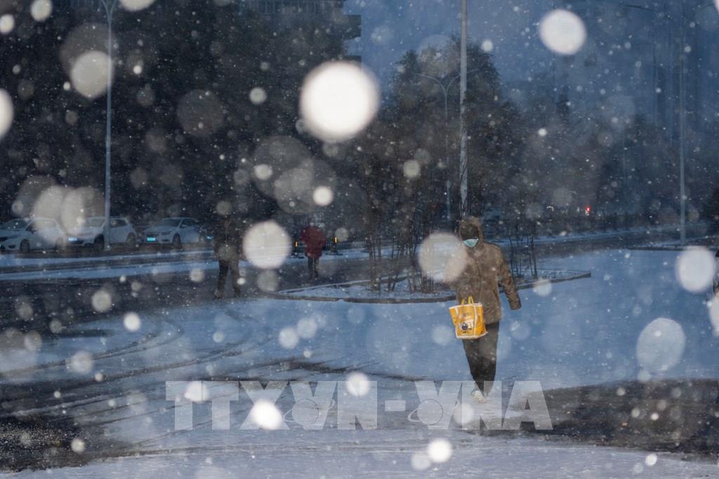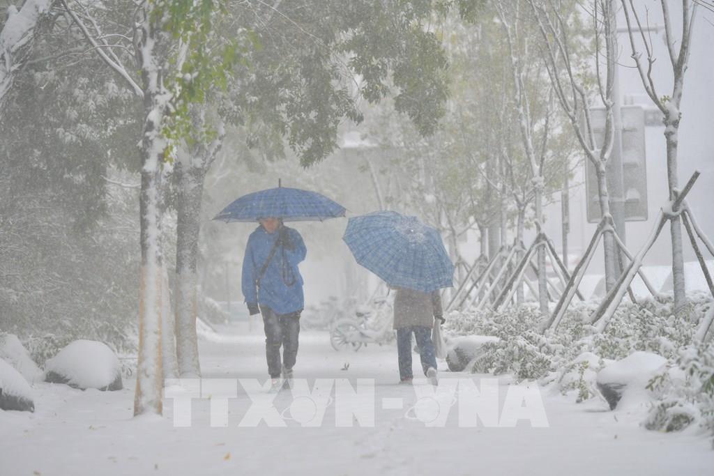 Người dân di chuyển trên đường phố dưới trời bão tuyết tại Thẩm Dương, tỉnh Liêu Ninh, Trung Quốc, ngày 6/11/2023. Ảnh: THX/TTXVN