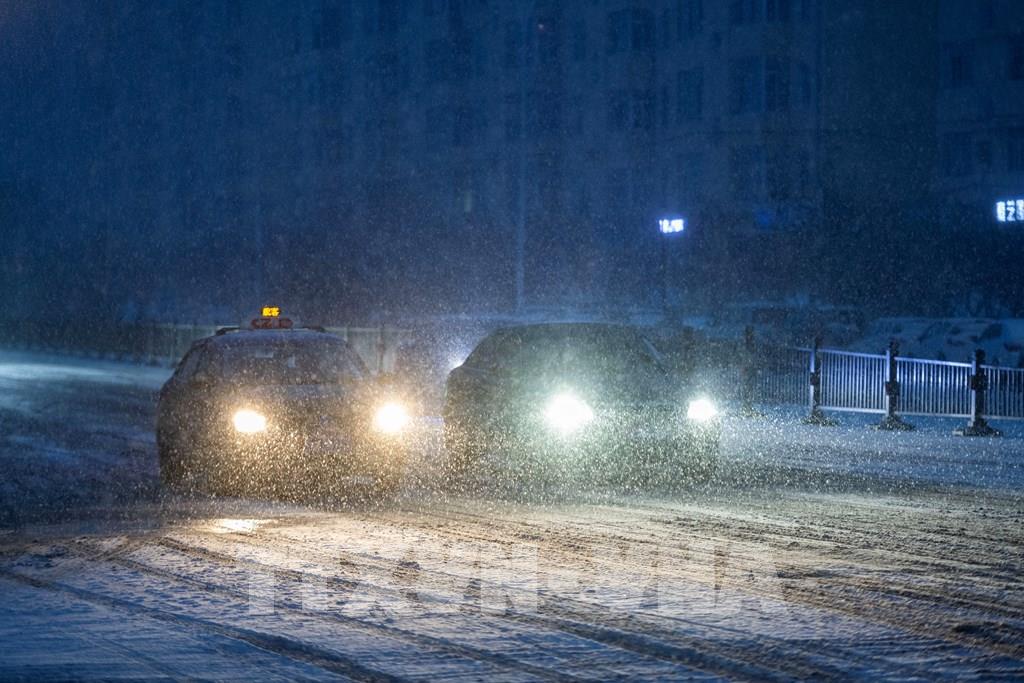 Các phương tiện di chuyển trên đường phố dưới trời bão tuyết tại Cáp Nhĩ Tân, tỉnh Hắc Long Giang, Trung Quốc, ngày 6/11/2023. Ảnh: THX/TTXVN