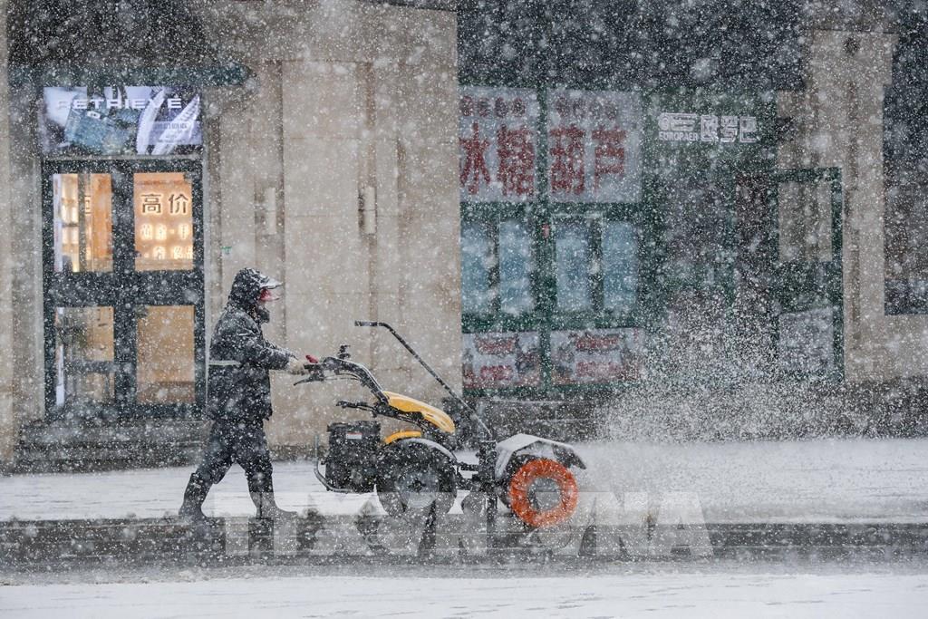 Nhân viên giao hàng di chuyển trên đường phố dưới trời bão tuyết tại Thẩm Dương, tỉnh Liêu Ninh, Trung Quốc, ngày 6/11/2023. Ảnh: THX/TTXVN