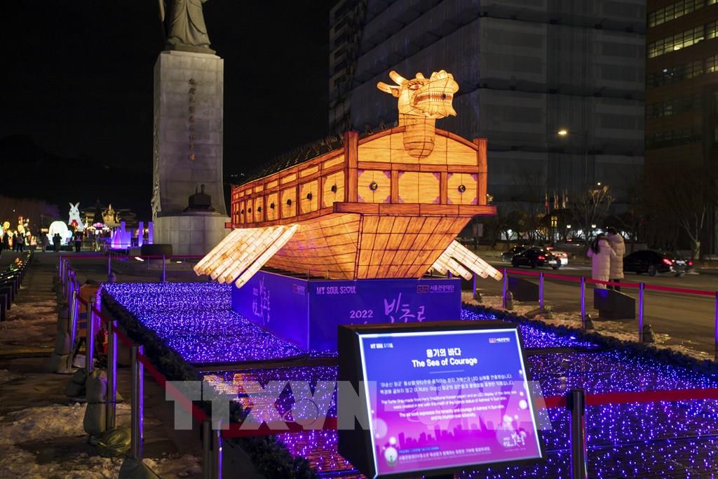 Đèn lồng tàu rùa chuyển động và nước biển được mô phỏng bằng đèn led được trưng bày ngay trước tượng Đô đốc Yi Sun-sin ở Quảng trường Gwanghwamun. Ảnh: Anh Nguyên, - PV TTXVN