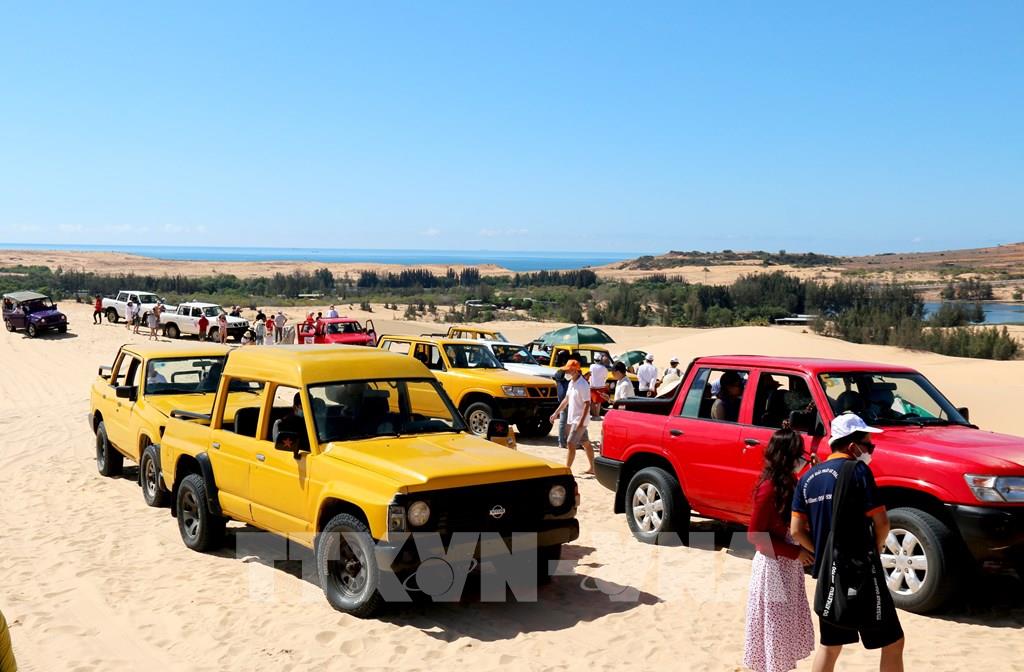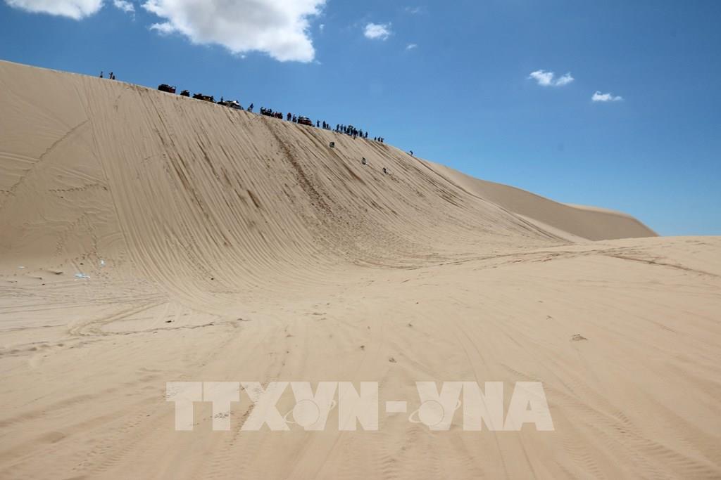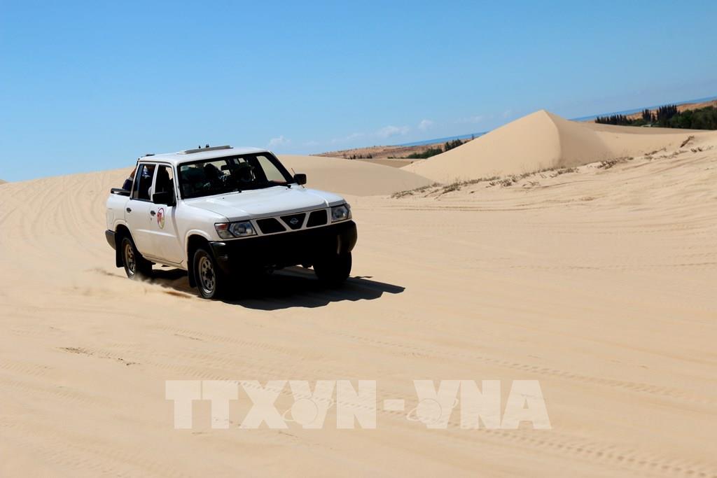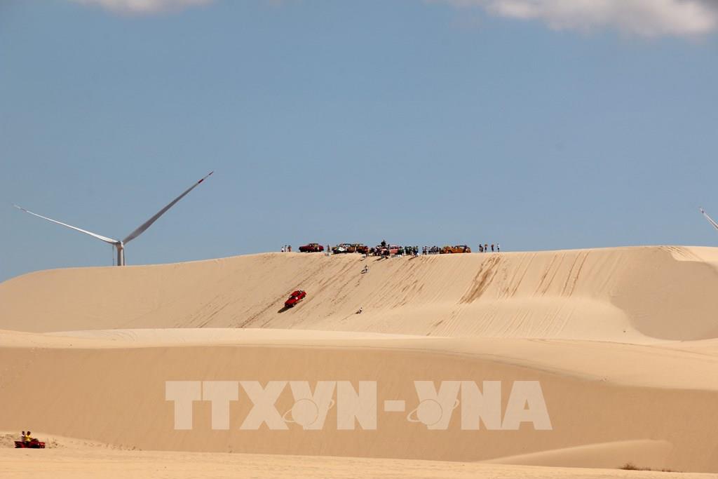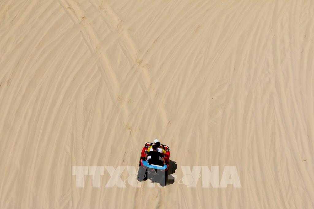 Du khách dùng xe địa hình di chuyển lên điểm cao nhất của đồi cát Bàu Trắng. Nguyễn Thanh - TTXVN