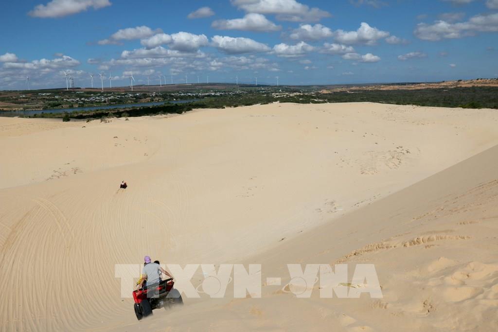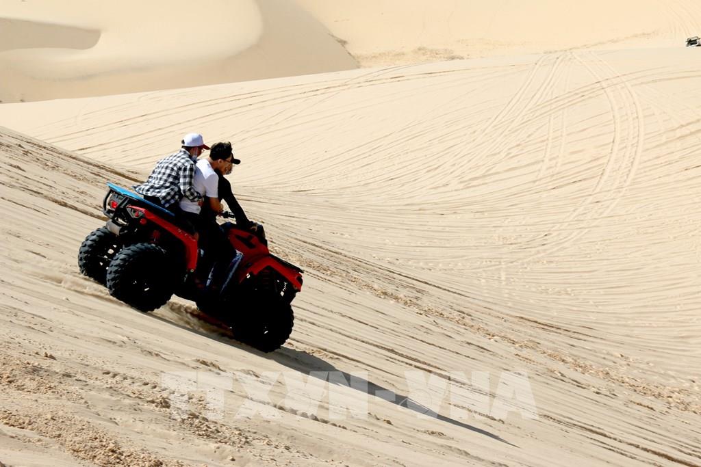 Đi xe địa hình là một hoạt động vui chơi hết sức độc đáo và mạo hiểm rất được du khách ưa thích khi đến Bàu Trắng. Nguyễn Thanh - TTXVN