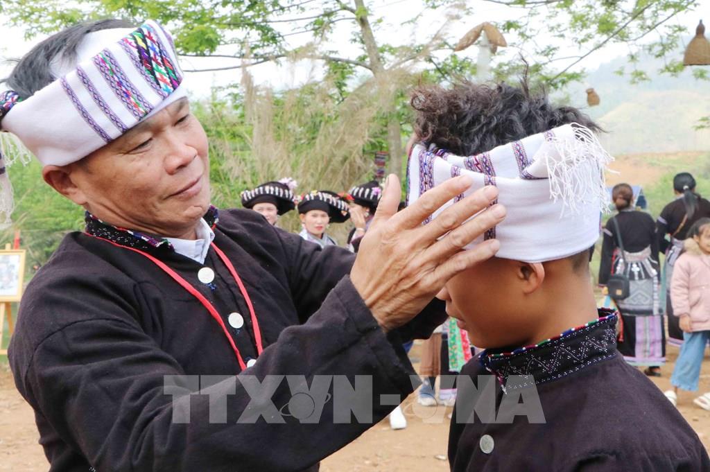 Khác với phụ nữ, trang phục của nam giới đơn giản hơn với với quần, áo được nhuộm chàm đen, đầu quấn khăn màu trắng. Ảnh: Nguyễn Oanh-TTXVN