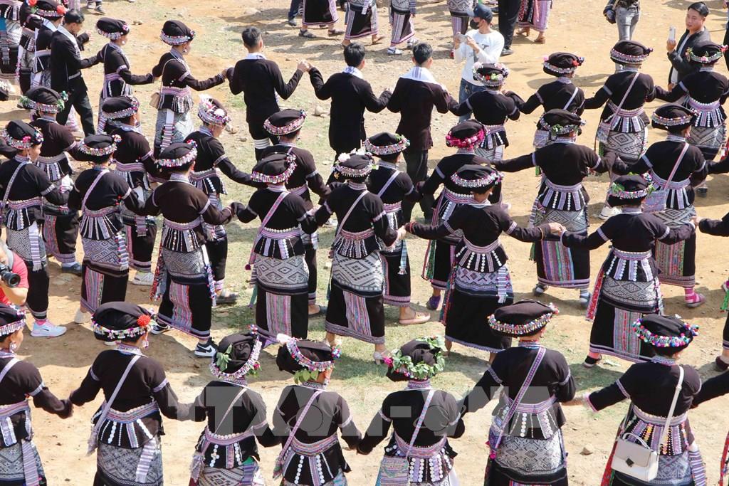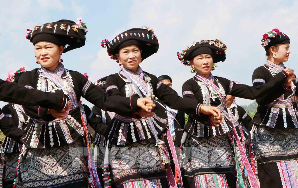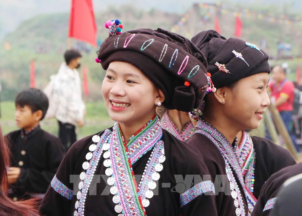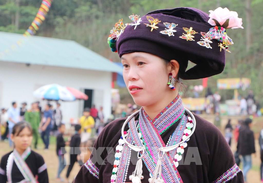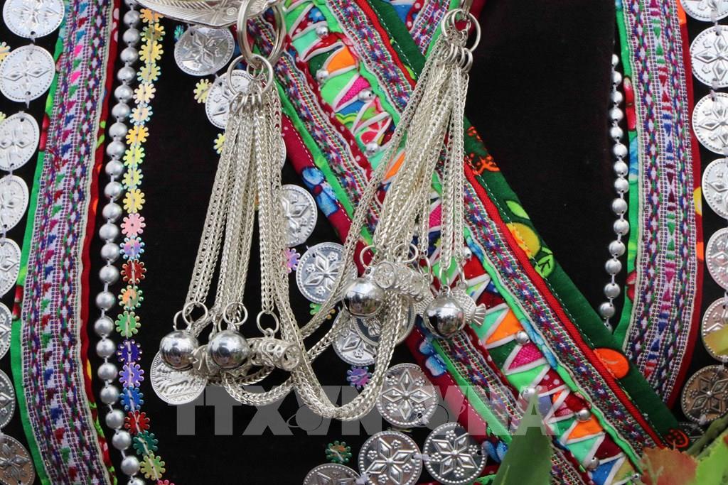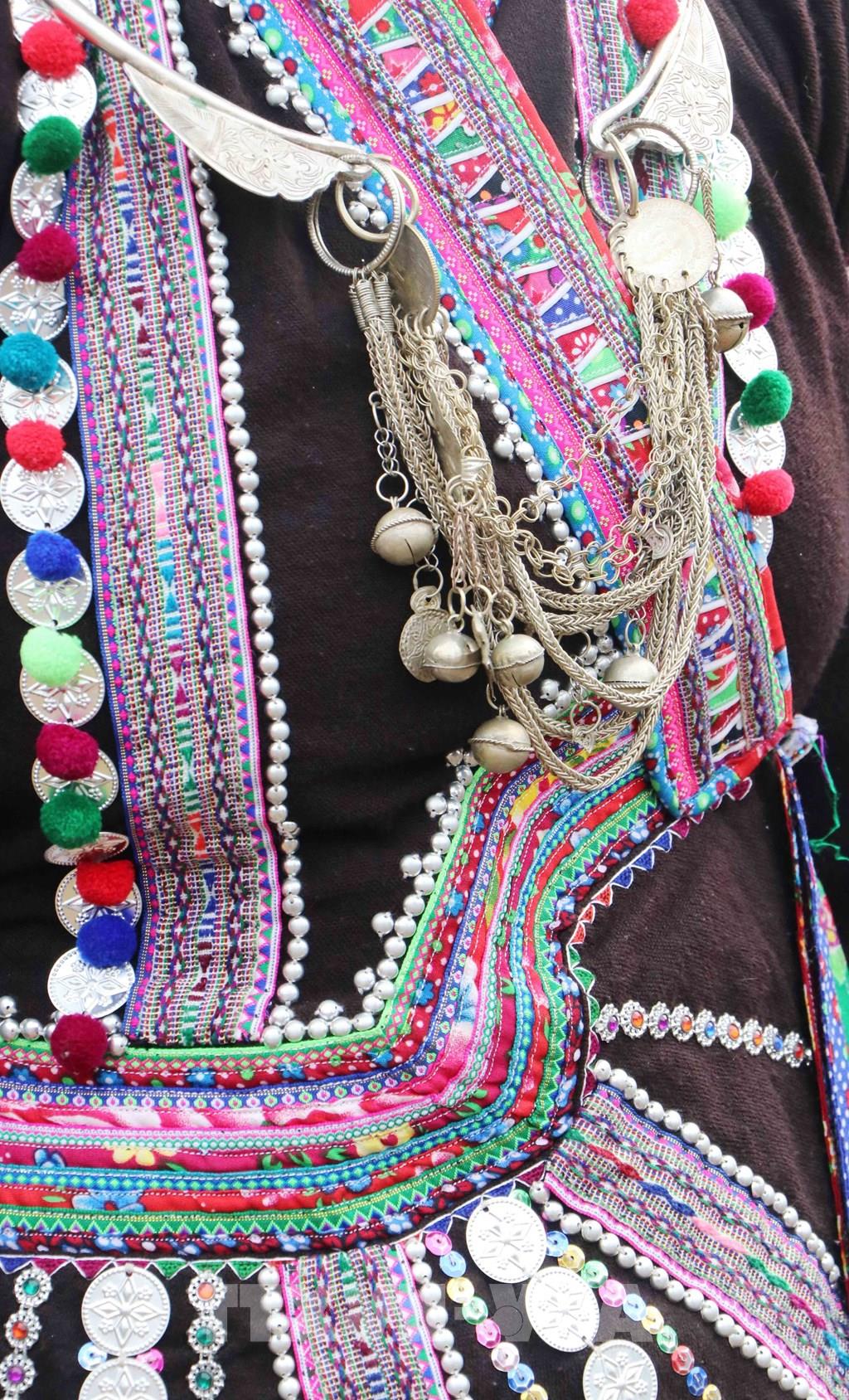 Hoa văn trên áo được thêu dệt cầu kỳ kết hợp với phụ kiện tạo nên nét nổi bật cho trang phục. Ảnh: Nguyễn Oanh-TTXVN