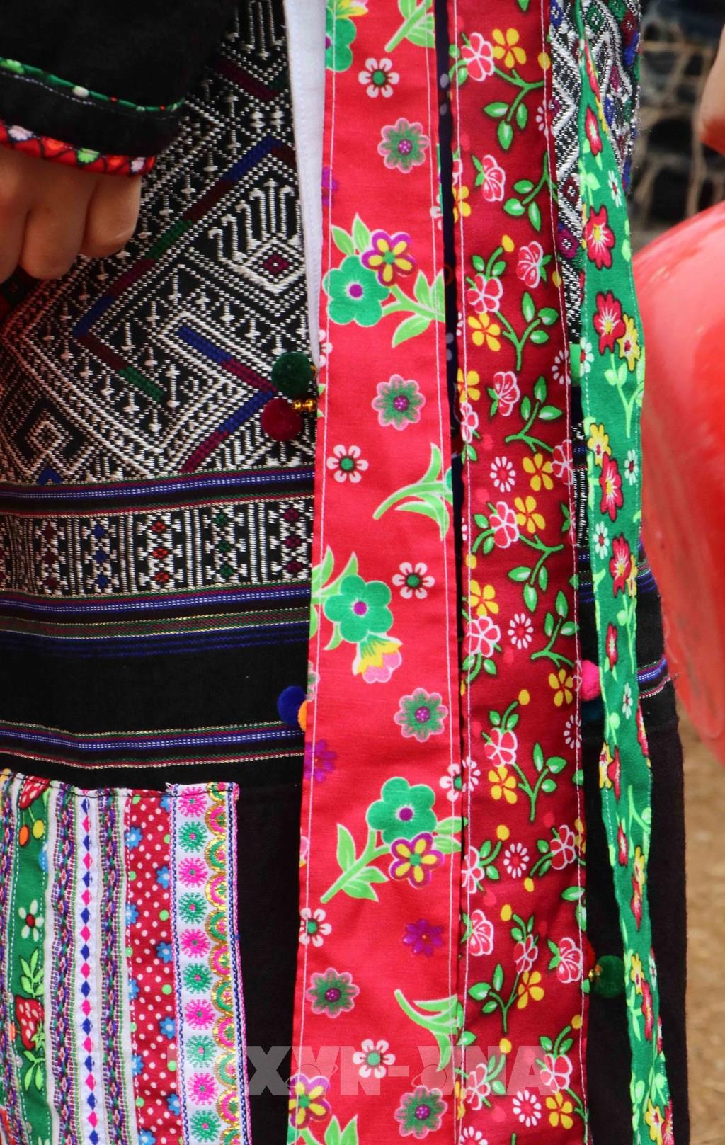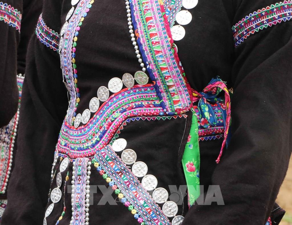 Hoa văn với nhiều màu sắc được dệt trên màu áo chàm đen tạo điểm nhấn nổi bật cho trang phục. Ảnh: Nguyễn Oanh-TTXVN