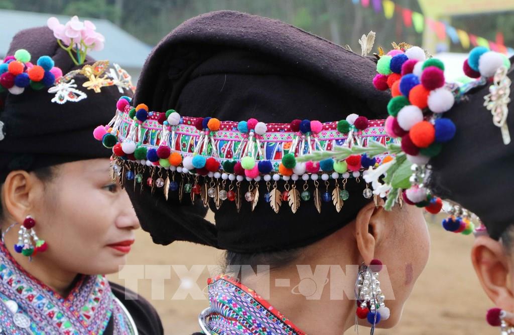 Khăn quấn đầu màu đen, được trang trí các phụ kiện cầu kỳ. Ảnh: Nguyễn Oanh-TTXVN