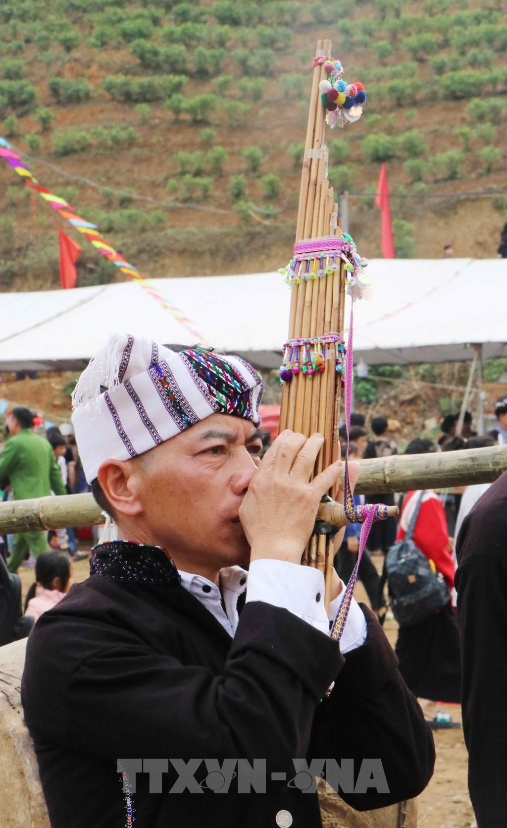 Nam giới lào trong trang phục truyền thống thổi khèn Bè. Ảnh: Nguyễn Oanh-TTXVN