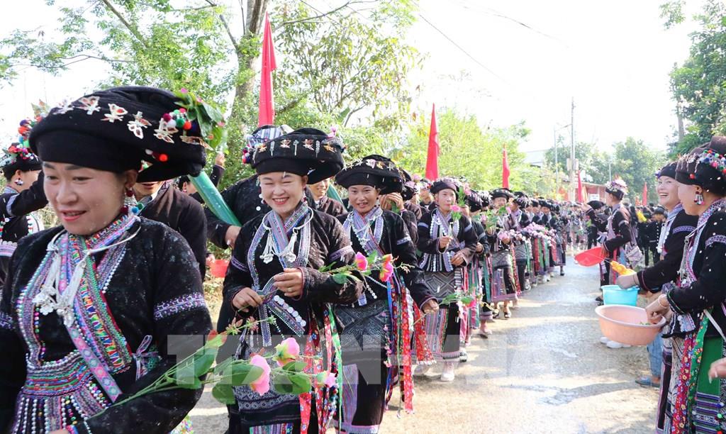 Trang phục truyền thống nổi bật của phụ nữ Lào khi tham gia Lễ hội Bun Vốc Nặm (Lễ hội té nước) tại xã Nà Tăm, huyện Tam Đường. Ảnh: Nguyễn Oanh-TTXVN