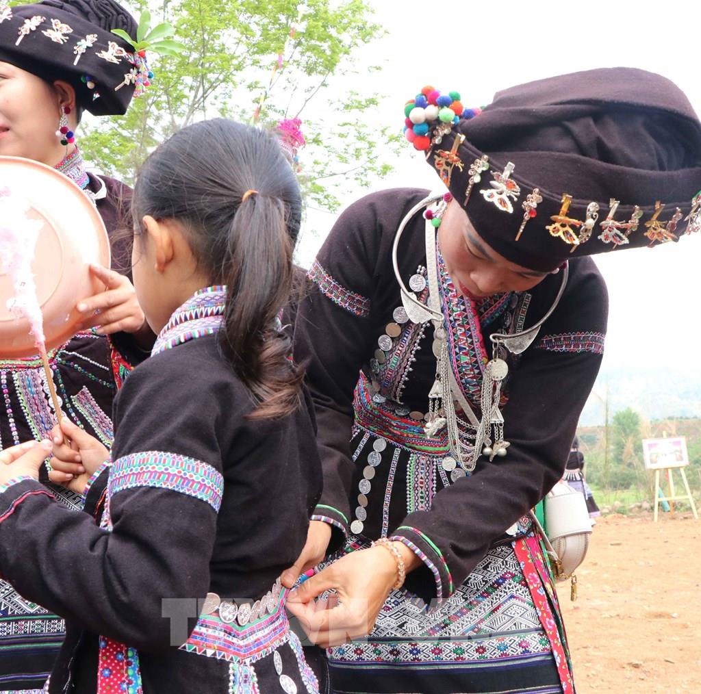 Một người mẹ sửa lại trang phục cho con gái vui Lễ hội Bun Vốc Nặm (Lễ hội té nước) tại xã Nà Tăm, huyện Tam Đường. Ảnh: Nguyễn Oanh-TTXVN