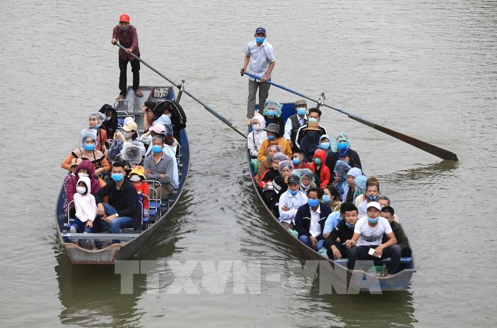 Du khách đi đò vào chùa Hương đều phải đeo khẩu trang phòng chống dịch. Ảnh: Thành Đạt - TTXVN