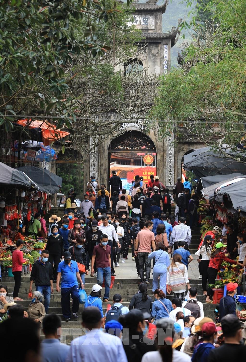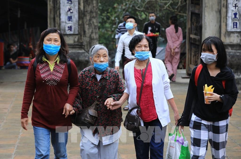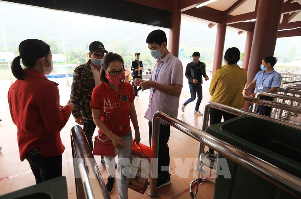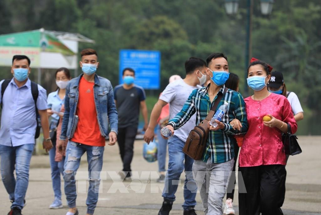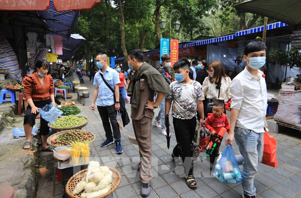 Du khách đến lễ chùa, tham quan, vãn cảnh chùa Hương đều phải thực hiện nghiêm thông điệp 5K của Bộ Y tế, trong đó có việc đeo khẩu trang phòng chống dịch. Ảnh: Thành Đạt - TTXVN