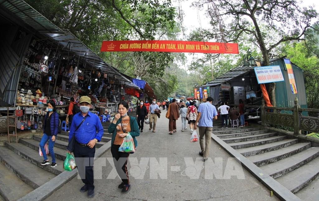 Du khách nhộn nhịp đi tham quan, lễ chùa Hương trong ngày đầu mở cửa trở lại. Ảnh: Thành Đạt - TTXVN