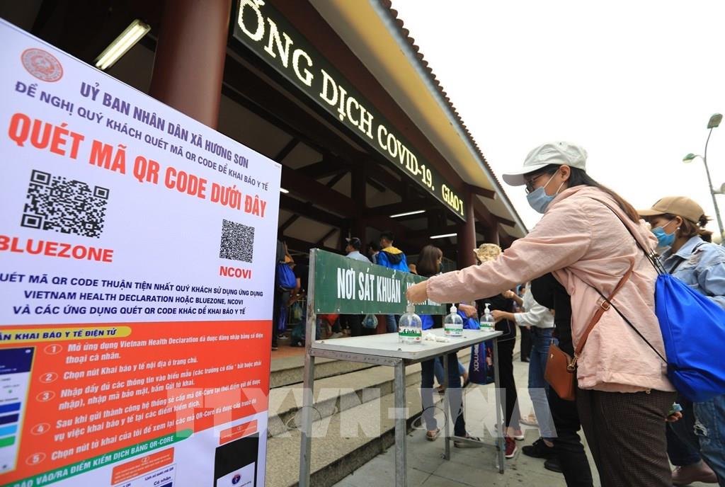 Trước cửa vào ga cáp treo chùa Hương được bố trí biển hướng dẫn quét mã QR-code để khai báo y tế và dung dịch rửa tay sát khuẩn cho du khách. Ảnh: Thành Đạt - TTXVN