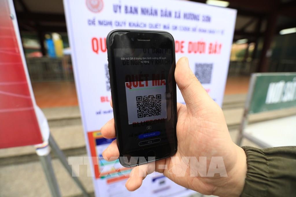 Người dân thực hiện quét mã QR-code để khai báo y tế theo quy định trước khi vào ga cáp treo mua vé tham quan chùa Hương. Ảnh: Thành Đạt - TTXVN