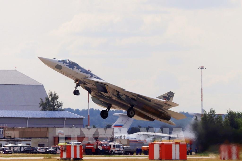 Máy bay tiêm kích thế hệ thứ năm Sukhoi Su-57 do phi công thử nghiệm Sergei Bodan điều khiển tham gia trình diễn bay tại MAKS 2021. Ảnh: Trần Hiếu - PV TTXVN tại Nga ; Trong khuôn khổ Triển lãm Hàng không và Vũ trụ quốc tế Moskva lần thứ 15 (MAKS 2021), công chúng được đón xem màn trình diễn bay hết sức ấn tượng với hàng chục lượt máy bay trực thăng, máy bay phản lực hạng nặng và tiêm kích hiện đại của quân đội Nga. Ảnh: Trần Hiếu - PV TTXVN tại Nga