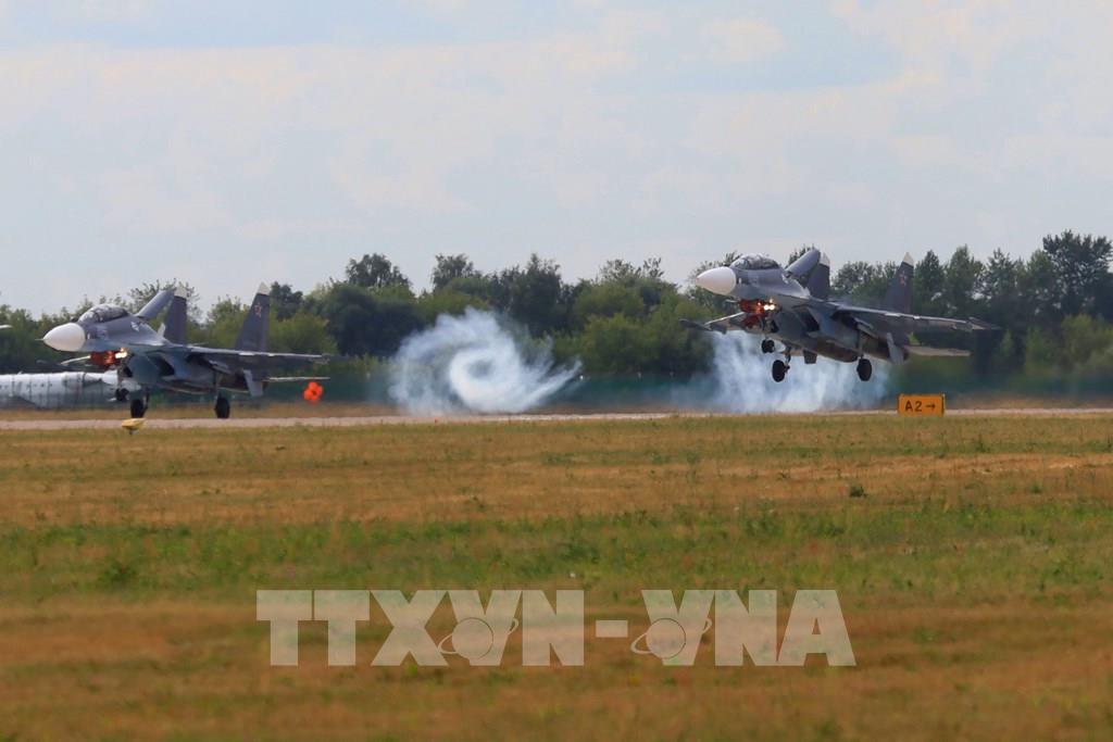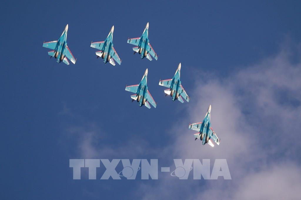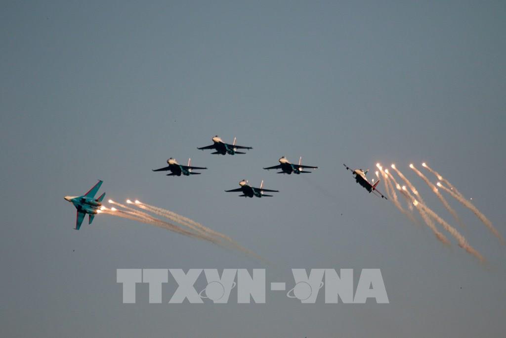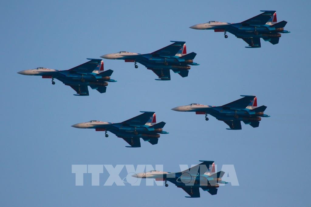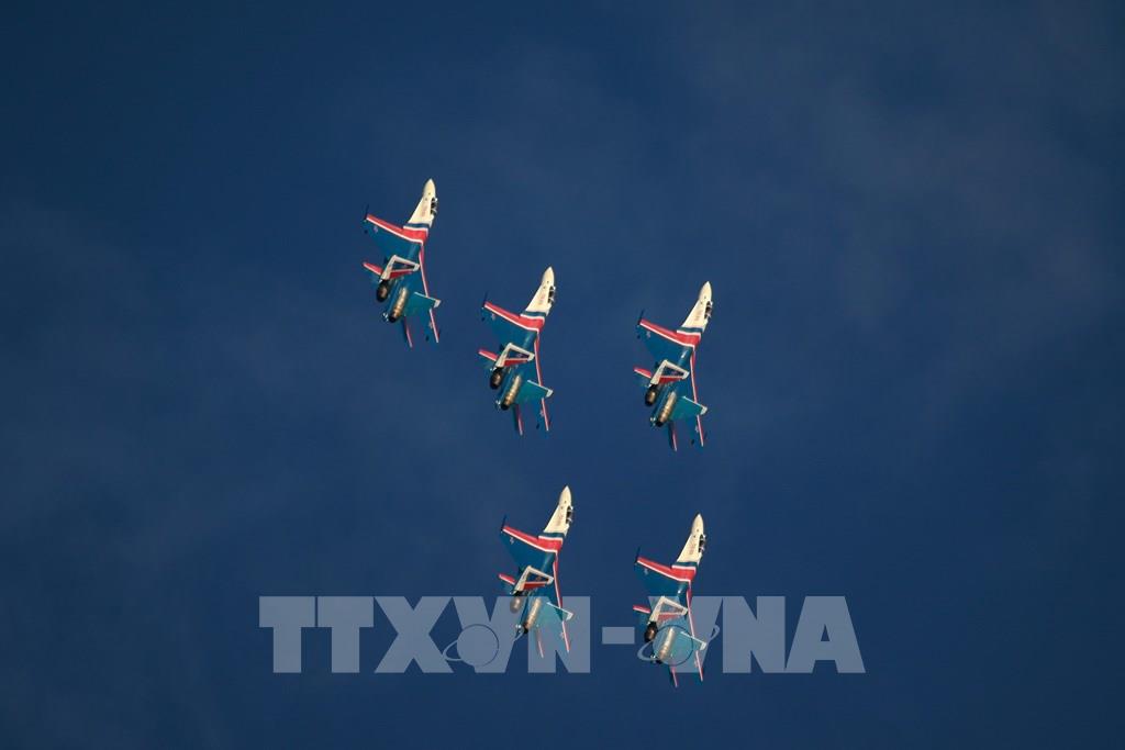 Biên đội máy bay tiêm kích Su-35 thể hiện trình diễn bay thuật lái. Ảnh: Duy Trinh - PV TTXVN tại Nga