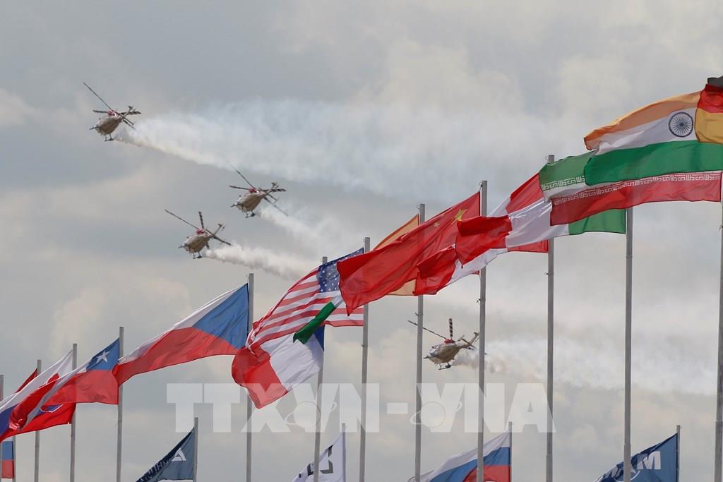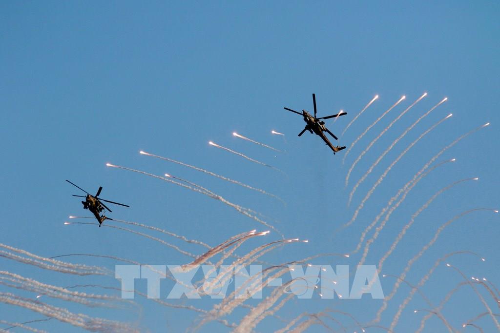 Biên đội trực thăng Nga kết thúc phần trình diễn trên không bằng màn phóng mồi bẫy nhiệt hết sức ấn tượng. Ảnh: Duy Trinh - PV TTXVN tại Nga