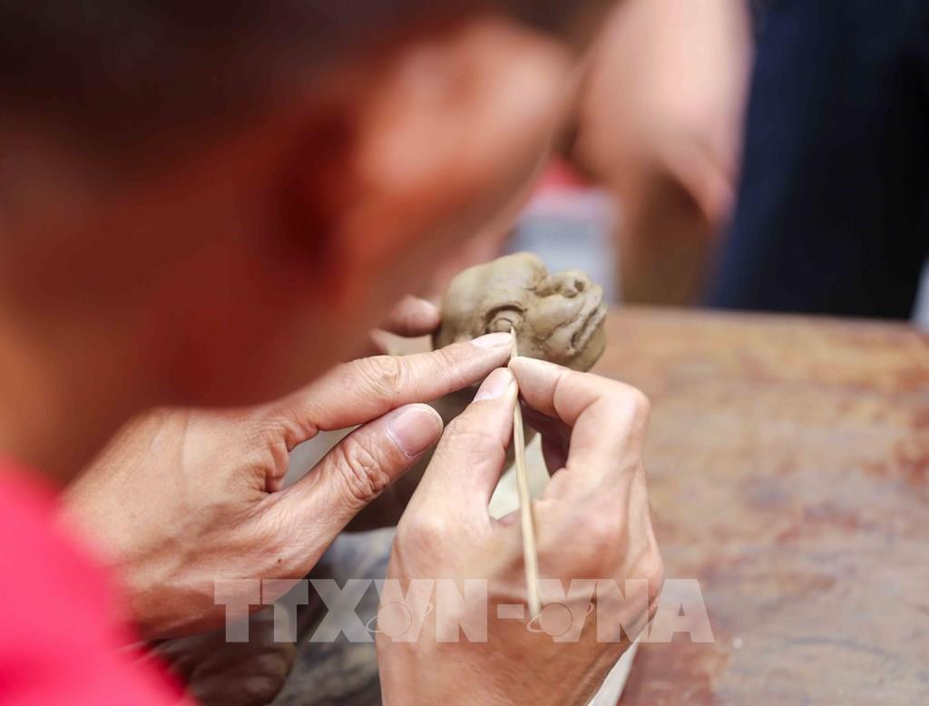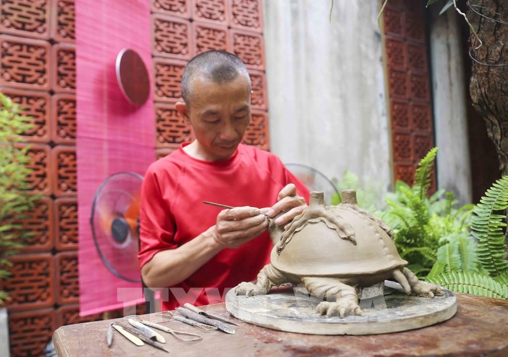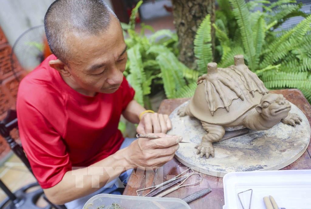 Nghệ nhân Nguyễn Thanh Tuấn (làng nghề Ngũ Xã) tỉ mỉ với công đoạn tạo mẫu. Ảnh: Tuấn Đức - TTXVN