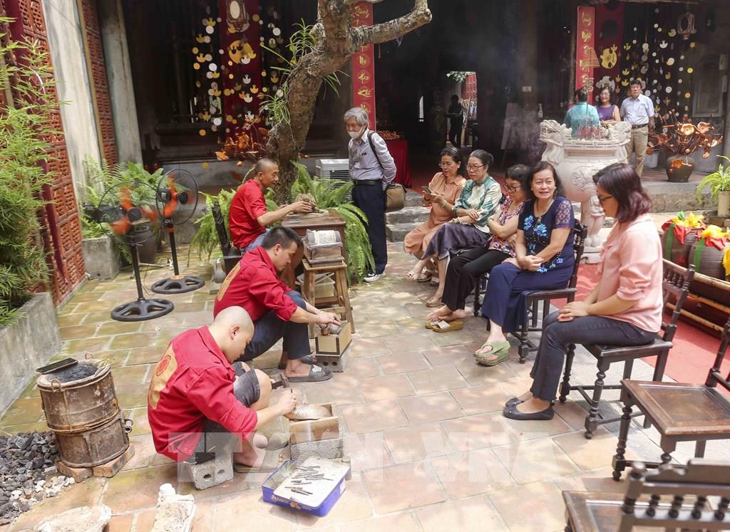 Buổi trình diễn kỹ thuật đúc đồng của làng nghề Ngũ Xã thu hút nhiều du khách. Ảnh: Tuấn Đức - TTXVN