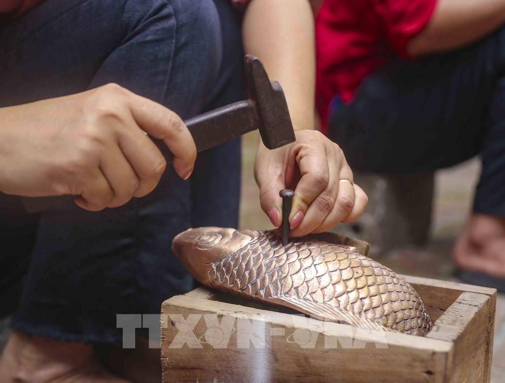 Khách trải nghiệm công đoạn chạm khắc hoa văn sản phẩm. Ảnh: Tuấn Đức - TTXVN