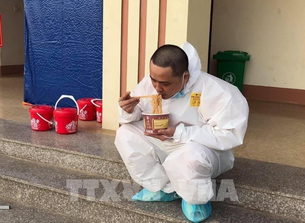 Y sĩ Hà Quang Huy, Bệnh viện Y học cổ truyền Yên Bái tranh thủ ăn trưa tại khu cách ly số 7. Ảnh: TTXVN