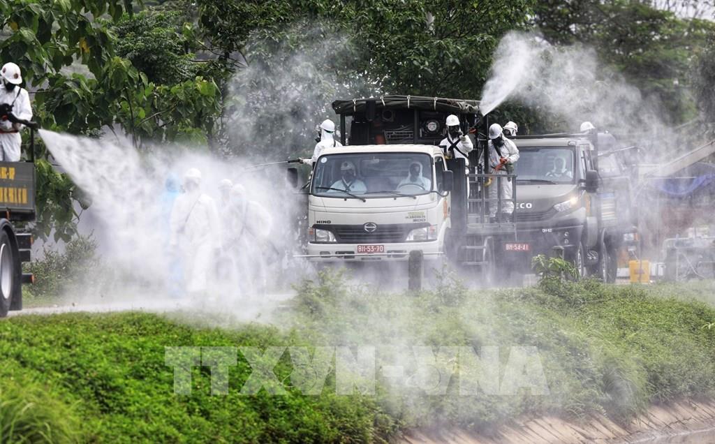 Bộ đội hóa học phun thuốc khử khuẩn toàn bộ khuân viên Bệnh viện Nhiệt đới Trung ương cơ sở 2. Ảnh: TTXVN