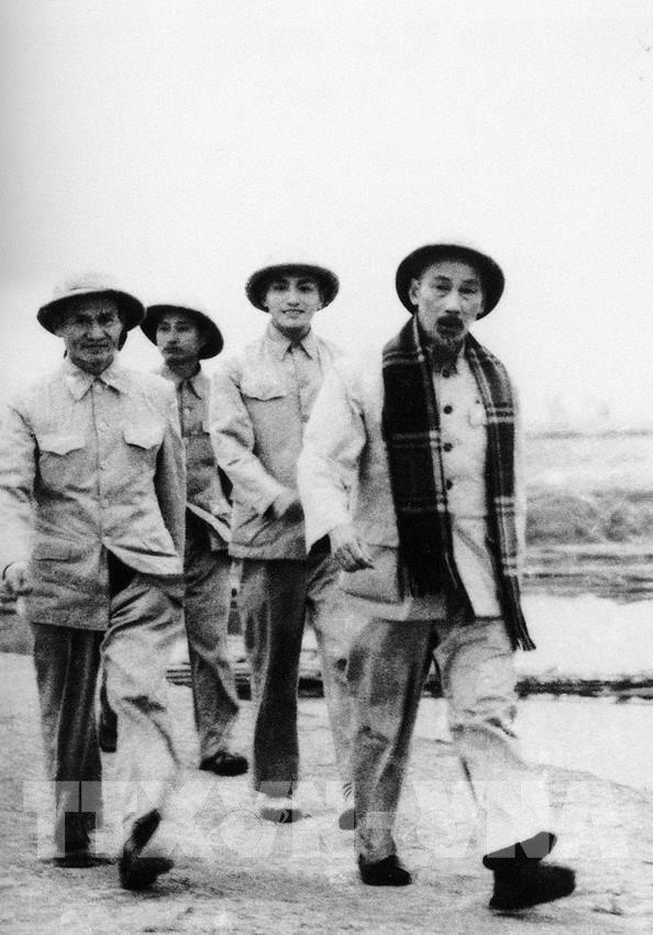 Phóng viên Võ Thế Ái của Việt Nam Thông tấn xã (đi sau Bác Hồ) tháp tùng Bác đi thăm công trình đập Thác Huống (Thái Nguyên) để viết tin, bài (tháng 12/1954). Ảnh: Tư liệu TTXVN